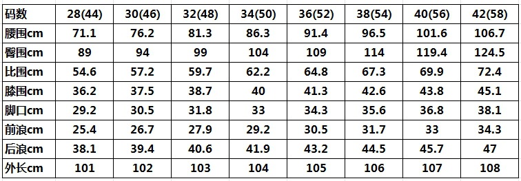| Talla | 28(44),30(46),32(48),34(50),36(52),38(54),40(56),42(58) |