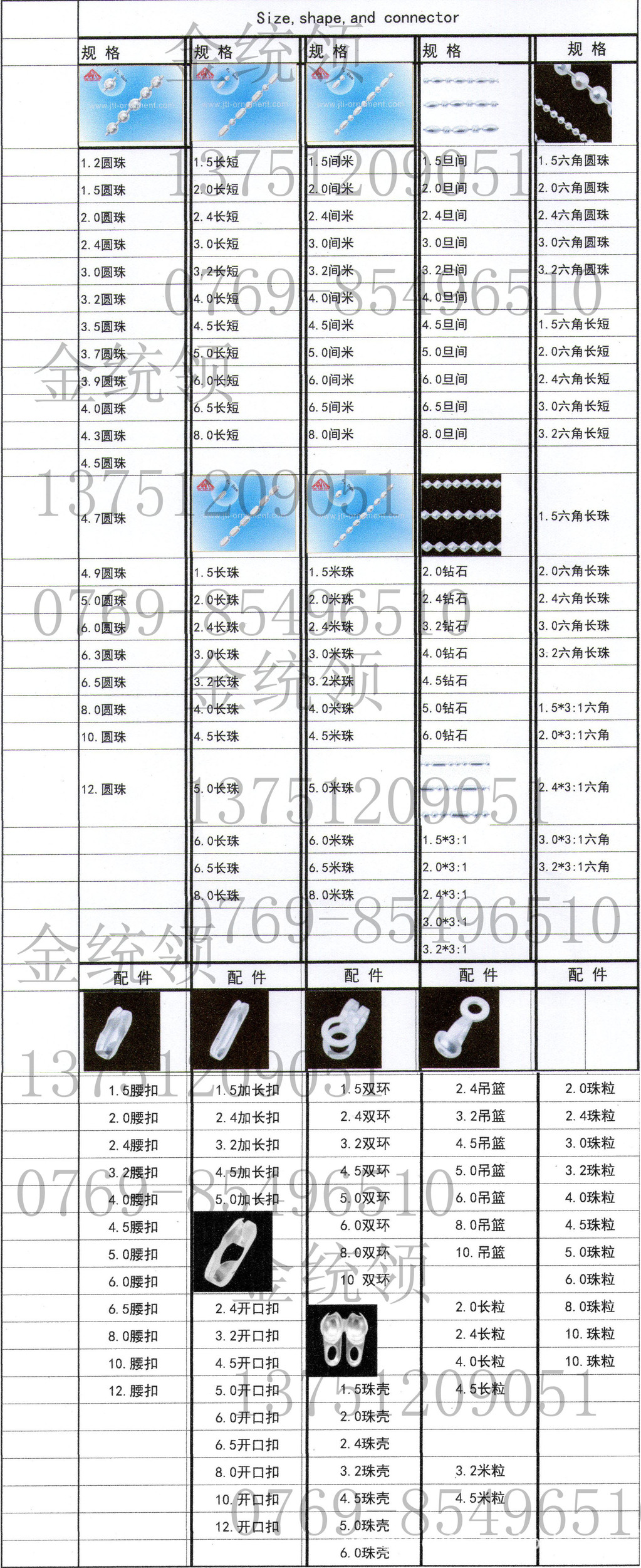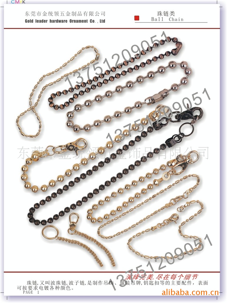 珠链又名波珠链,波仔链,五金珠链,金属珠链。东莞市金统领五金饰品有限公司专业生产各种珠链,本产品材质有铁、铜、304/316L不锈钢等,常规珠链直径有:1.5mm、1.6mm、2.0mm、2.4mm、3.0mm、3.2mm、4.0mm、4.5mm、5.0mm、6.0mm、8.0mm、10.0mm、12.0mm等,按珠子形状分有圆珠链、长短珠链、长珠链,批角珠链、米珠链,米间珠链,钻石链等,本产品长度、颜色可按需要自定,同产品具有比其他厂家的产品重、拉力大、珠距密,珠腰头易扣等特点。本厂拥有自己的电镀车间,地保证了产品的质量,本产品质量上乘,价格优惠,货期准确,应用广泛,适用于玩具、箱包、手袋、服饰、饰品、礼品、灯饰、文具、家具、电子、首饰、鞋帽、、工艺品等产品。此外,我们还有大量有孔单珠和珠腰扣出售,以满足不同客户需求.