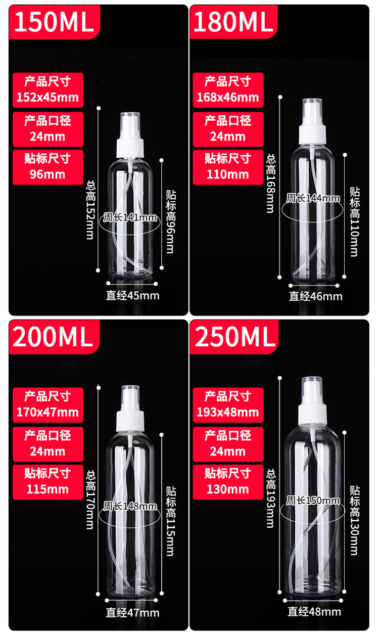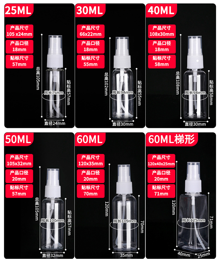 | Modelo de especificación | 3ml,5ml,8ml,10ml,15ml,20ml,25ml,30ml,40ml,50ml,60ml,Trapecio de 60ml,80ml,100ml,100ml de escala,100ml cuadrado,100 ml24 boca delgada,120ml,Trapecio de 30ml,Escala de 50ml |
