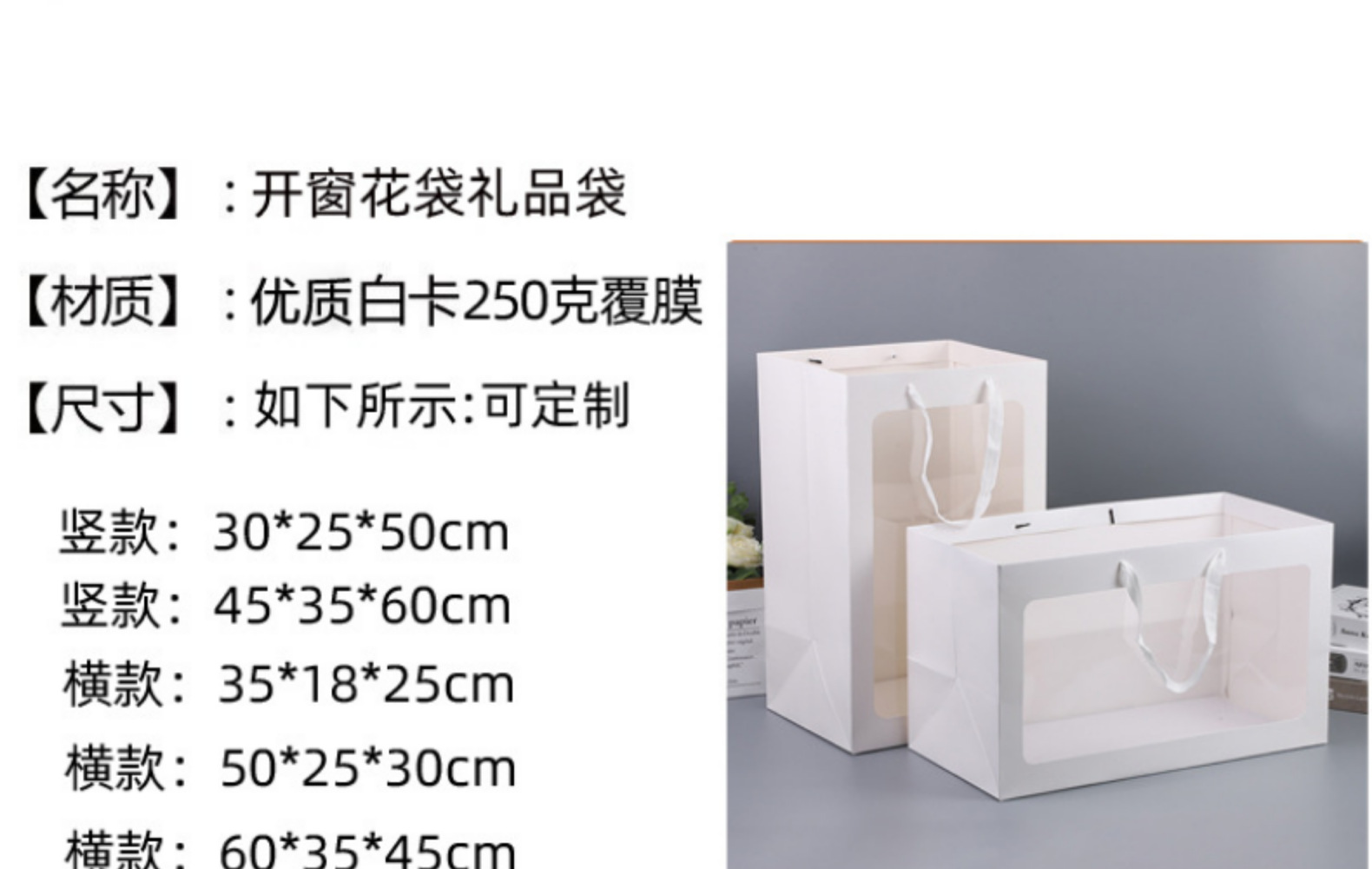 | Modelo de especificación | Blanco; 15*10*20 cm vertical,Blanco; 18*13*25 cm vertical,Blanco; 20*16*30 cm vertical,Blanco; 25*18*35cm vertical,Blanco; 30*25*50cm vertical extra grande,Blanco; 45*35*60cm vertical de gran tamaño,Blanco; 35*18*25cm horizontal,Blanco; 50*25*30cm horizontal extra grande,Blanco; 60*35*45cm horizontal de gran tamaño,Patrón de mármol blanco; estilo vertical de 15*10*20 cm,Patrón de mármol blanco; estilo vertical de 18*13*25 cm,Patrón de mármol blanco; estilo vertical de 20*16*30 cm,Patrón de mármol blanco; 25*18*35cm vertical,Negro; 15*10*20 cm vertical,Negro; 18*13*25 cm vertical,Negro; 20*16*30 cm vertical,Negro; 25*18*35cm vertical,Color de papel kraft; estilo vertical de 15*10*20 cm,Color de papel kraft; estilo vertical de 18*13*25 cm,Color de papel kraft; estilo vertical 20*16*30 cm,Color de papel kraft; 25*18*35cm vertical,Rojo; 15*10*20 cm vertical,Rojo; 18*13*25 cm vertical,Rojo; 20*16*30 cm vertical,Rojo; 25*18*35cm vertical,Marco negro sobre fondo blanco; estilo vertical de 15*10*20 cm,Marco negro sobre fondo blanco; estilo vertical de 18*13*25 cm,Marco negro sobre fondo blanco; estilo vertical de 20*16*30 cm,Marco negro sobre fondo blanco; 25*18*35cm vertical,Marco blanco sobre fondo negro; estilo vertical de 18*13*25 cm,Marco blanco sobre fondo negro; estilo vertical de 20*16*30 cm,Marco blanco sobre fondo negro; 25*18*35cm vertical,Rosa claro; estilo vertical de 15*10*20 cm,Rosa claro; 18*13*25 cm vertical,Rosa claro; 20*16*30 cm vertical,Rosa claro; 25*18*35cm vertical |