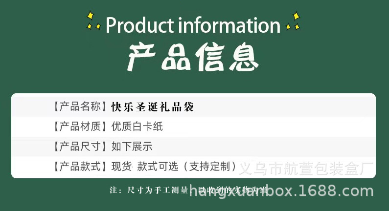 | Modelo de especificación | Pequeña (14x15x7); Alce Navidad,Pequeña (14x15x7); Feliz Navidad,Trompeta (14x15x7); Noche de Navidad,Pequeña (14x15x7); Feliz Navidad,Pequeño (14x15x7); Regalo de Navidad,Pequeña adición (18x15x8); Alce Navidad,Pequeña adición (18x15x8); Feliz Navidad,Pequeño plus (18x15x8); Noche de Navidad,Pequeña adición (18x15x8); Feliz Navidad,Pequeño plus (18x15x8); Regalo de Navidad,Medio (26x11x20); Alce Navidad,Medio (26x11x20); Feliz Navidad,Medio (26x11x20); Noche de Navidad,Medio (26x11x20); Feliz Navidad,Medio (26x11x20); Regalo de Navidad,Grande (30.5x12x27); Alce Navidad,Grande (30.5x12x27); Feliz Navidad,Tamaño grande (30.5x12x27); Noche de Navidad,Grande (30.5x12x27); Feliz Navidad,Regalo de Navidad grande (30.5x12x27) |