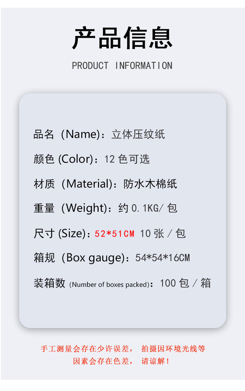 | color | Rosa [10 hojas de papel impreso en relieve] 50*50CM/hoja,Cian [10 hojas de papel impreso en relieve] 50*50CM/hoja,Negro [10 hojas de papel impreso en relieve] 50*50CM/hoja,Borgoña [10 hojas de papel impreso en relieve] 50*50CM/hoja,Polvo colorete [10 hojas de papel gofrado] 50*50CM/hoja,Smoke Soft Purple [Papel en relieve Puff 10 hojas] 50*50CM/hoja,Matcha verde [10 hojas de papel gofrado hojaldre] 50*50CM/hoja,Índigo [10 hojas de papel gofrado hojaldre] 50*50CM/hoja,Maltosa [10 hojas de papel gofrado] 50*50CM/hoja,Chardonnay Amarillo [Papel en relieve hojaldre 10 hojas] 50*50CM/hoja,Azul agua claro [10 hojas de papel gofrado hojaldre] 50*50CM/hoja,Blanco crema [10 hojas de papel gofrado hojaldre] 50*50CM/hoja,Celebration Red [10 hojas de papel gofrado hojaldre] 50*50CM/hoja,Negro grafito [Papel en relieve Puff 10 hojas] 50*50CM/hoja,Crystal Rose [10 hojas de papel gofrado] 50*50CM/hoja,Café con leche [10 hojas de papel gofrado] 50*50CM/hoja,Marrón veneciano [10 trozos de papel cielo estrellado],Sfumato violeta [10 trozos de papel cielo estrellado],Cielo estrellado [10 pinturas al óleo],Verde Amor Amarillo [10 pinturas al óleo],Estrella Brillante Púrpura [10 piezas de papel cielo estrellado],Vitay Garden [10 pinturas al óleo],Fantasy Purple [10 piezas de papel cielo estrellado],Girasoles [10 pinturas al óleo],Champán claro [Rosa: 10 hojas de papel en relieve tridimensional] 53*40 CM,Gris Púrpura [Rosa—10 hojas de papel en relieve tridimensional] 53*40CM,Polvo de melocotón [Rosa: 10 hojas de papel en relieve tridimensional] 53*40 CM,Verde menta [Rosa: 10 hojas de papel en relieve tridimensional] 53*40 CM,Gris cálido [Rosa: 10 hojas de papel en relieve tridimensional] 53*40 CM,Blanco [Rosa: 10 hojas de papel en relieve tridimensional] 53*40CM,Modelo C [lirio de los valles 10 hojas/paquete],Un estilo [lirio de los valles 10 hojas/paquete],Modelo B [lirio de los valles 10 hojas/paquete],Modelo D [lirio de los valles 10 hojas/paquete],Polvo púrpura fragante [10 hojas de papel en relieve vidriado de color] 50*50cm,Polvo de miel [10 hojas de papel en relieve vidriado de color] 50*50cm,Marshmallow [10 hojas de papel en relieve esmaltado de colores] 50*50cm,Maltosa [10 hojas de papel en relieve esmaltado de colores] 50*50cm,Negro grafito [papel en relieve esmaltado de color 10 hojas] 50*50cm,Rojo maya [10 hojas de papel en relieve esmaltado] 50*50cm,Piel de vaca exquisita [papel en relieve esmaltado de colores 10 hojas] 50*50cm,Té en polvo [10 hojas de papel en relieve vidriado de color] 50*50cm,Cúrcuma de arce [10 hojas de papel en relieve esmaltado de colores] 50*50cm,Café con leche [10 hojas de papel en relieve esmaltado] 50*50cm,Gris claro [10 hojas de papel en relieve esmaltado] 50*50cm |