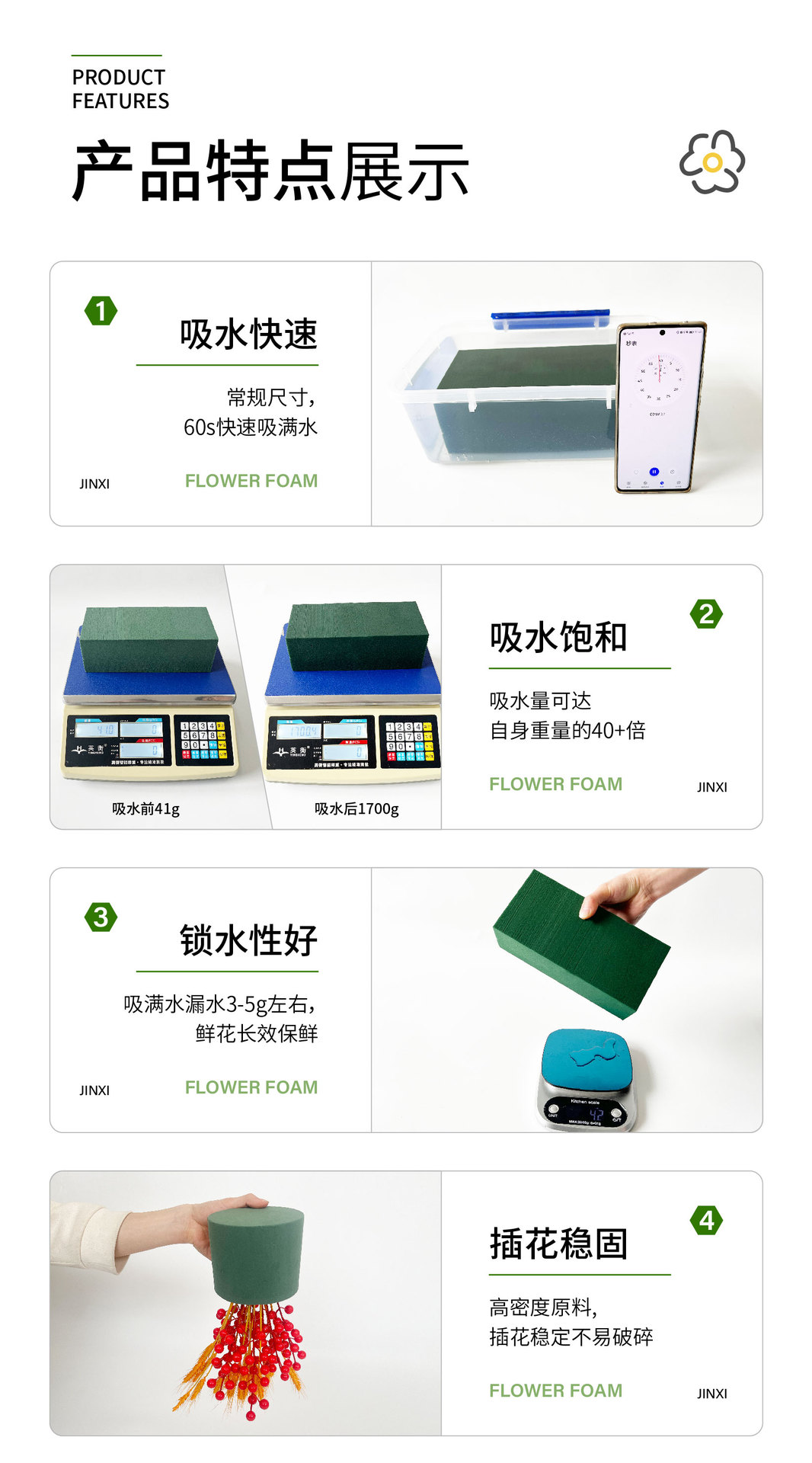 | Especificaciones y modelos | Verde; Barro floral de la marca Jinxi, absorbente de agua más de 40 veces, 20 unidades/caja,Verde; Bloques de barro de flores verdes, alta densidad y resistencia a la presión, 100 unidades/caja,Verde; barro de flores secas, 100 piezas por caja, 230*105*70 mm,Verde; barro de flores redondas (tamaño personalizado),Verde; Barro floral esférico de 9cm (tamaño personalizado),Verde; Verde 140*80*40MM, 360 piezas/,Verde; Verde 198*89*60MM,Verde; Verde 140*80*45mm,Verde; 110*75*40 |