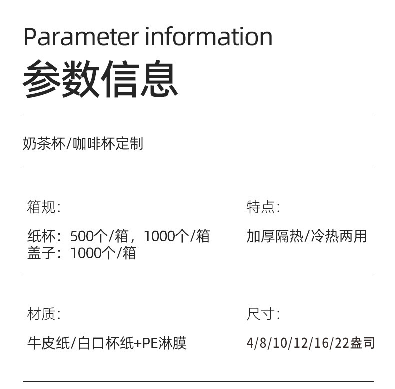 | Modelo de especificación | 8oz taza de papel de boca blanca taza de doble capa (calibre 80);,8OZ taza de doble capa de papel kraft (calibre 80); uno,8oz taza de papel de boca blanca taza de doble capa (calibre 90);,8OZ taza de doble capa de papel kraft (calibre 90);,Taza de doble capa de papel kraft 10OZ; uno,Taza de doble capa de papel de taza de boca blanca de 10oz; uno,Taza de doble capa de papel kraft 12OZ; uno,Taza de doble capa de papel de taza de boca blanca de 12oz; uno,16oz taza de papel de boca blanca taza de doble capa; uno,Taza de doble capa de papel kraft 16OZ; uno,Taza de doble capa de papel kraft 22OZ; uno,Taza de doble capa de papel de taza de boca blanca de 22oz; uno,8OZ-PP cubierta blanca; a,8OZ-PP cubierta negra; una,Cubierta en forma de 8OZ-U blanca; uno,Cubierta en forma de 8OZ-U negra; uno,10/12/16OZ-PP cubierta blanca; a,10/12/16OZ-PP cubierta negra; a,10/12/16OZ-U cubierta blanca; a,10/12/16OZ-U cubierta negra; a,10/12/16OZ-U cubierta transparente; |