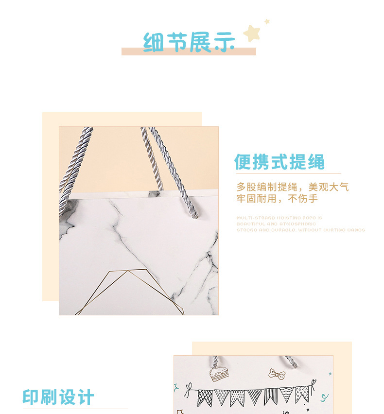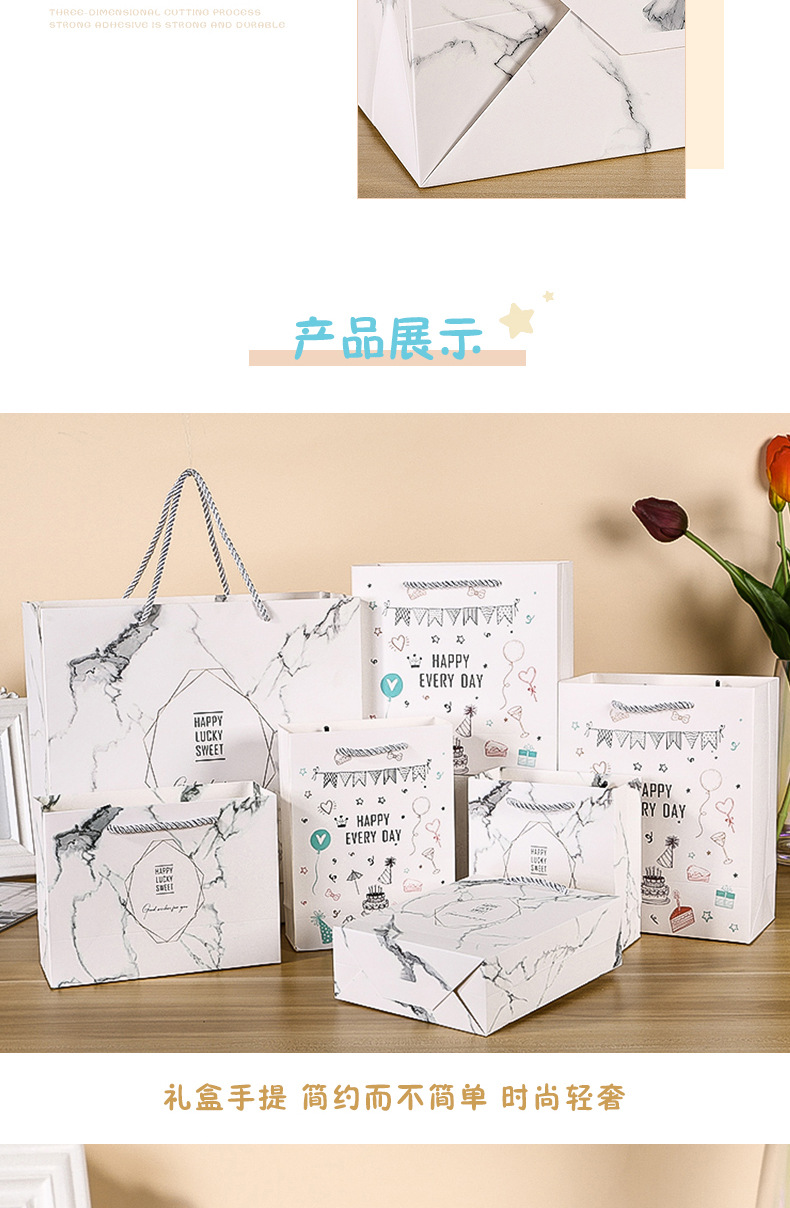 | Modelo de especificación | Bolsa de papel de mármol (10 piezas);14*7*15cm;210g tarjeta blanca |