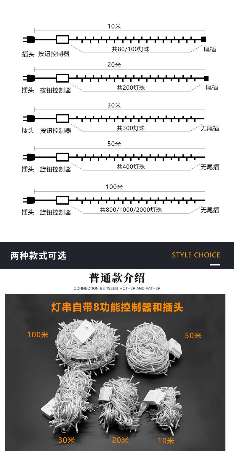 | Potencia | 10 m 100 conexión de la cola de la lámpara,10 m 100 lámpara macho y conector hembra,20 M 200 conexión de la cola de la lámpara,20 M 200 lámpara de conexión macho y hembra,30 m 300 conexión de la cola de la lámpara,Lámpara de los 50 M 400 sin la conexión de la cola,50 m 400 lámpara macho y hembra conexión,50 m 800 lámpara de conexión macho y hembra,50 m 1600 lámpara macho y hembra enchufe,100 m 600 lámpara sin conexión de cola,100 m 800 lámpara sin conexión de cola,100 m 1000 lámpara sin conexión de cola,Lámpara del 100 M 2000 sin la conexión de la cola,3A impermeable controlador de luz constante (dedicado para conexión macho y hembra),Memoria Dispositivo flash de ocho funciones (dedicado para conexión macho y hembra),Dispositivo flash de ocho funciones de control remoto (dedicado para conexión macho y hembra) |