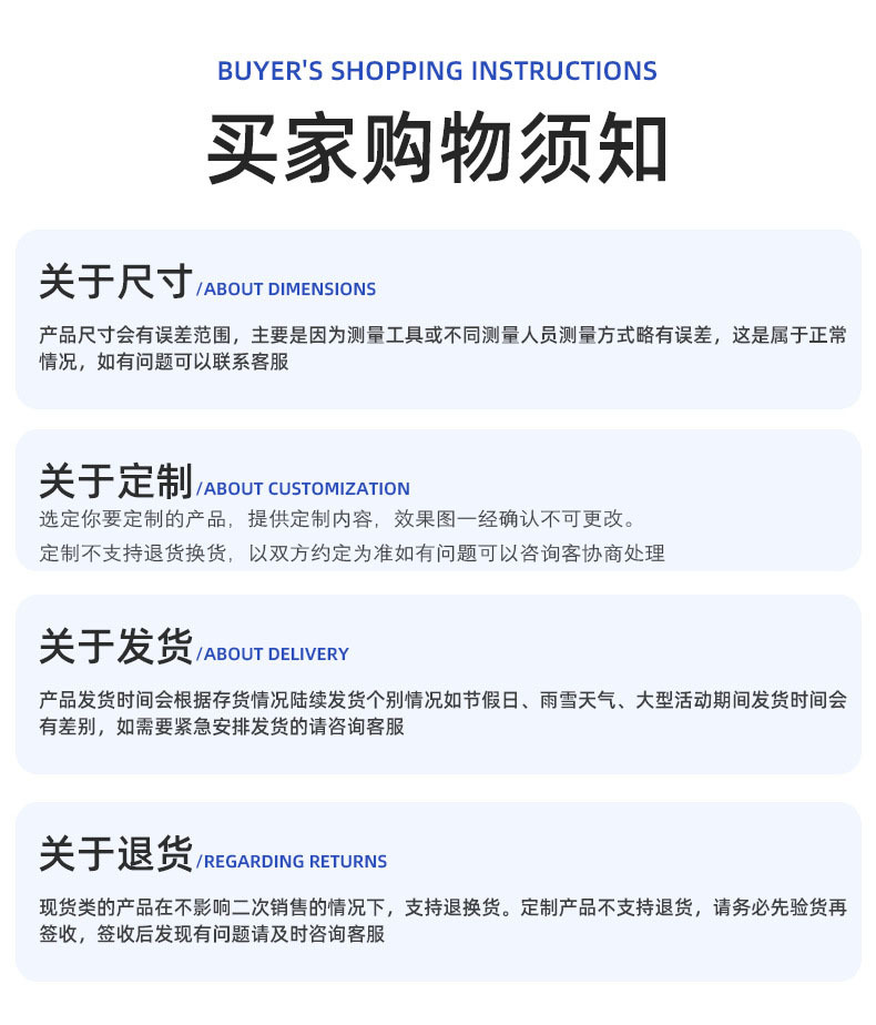 6.售后服务是公司最基本的服务,我们愿意为大家提供良好的售后服务,同时, 良好的售后服务也需要客户的配合,请在退换货前仔细阅读以上说明,请遵循公司以上制度办理,以免影响售后服务质量