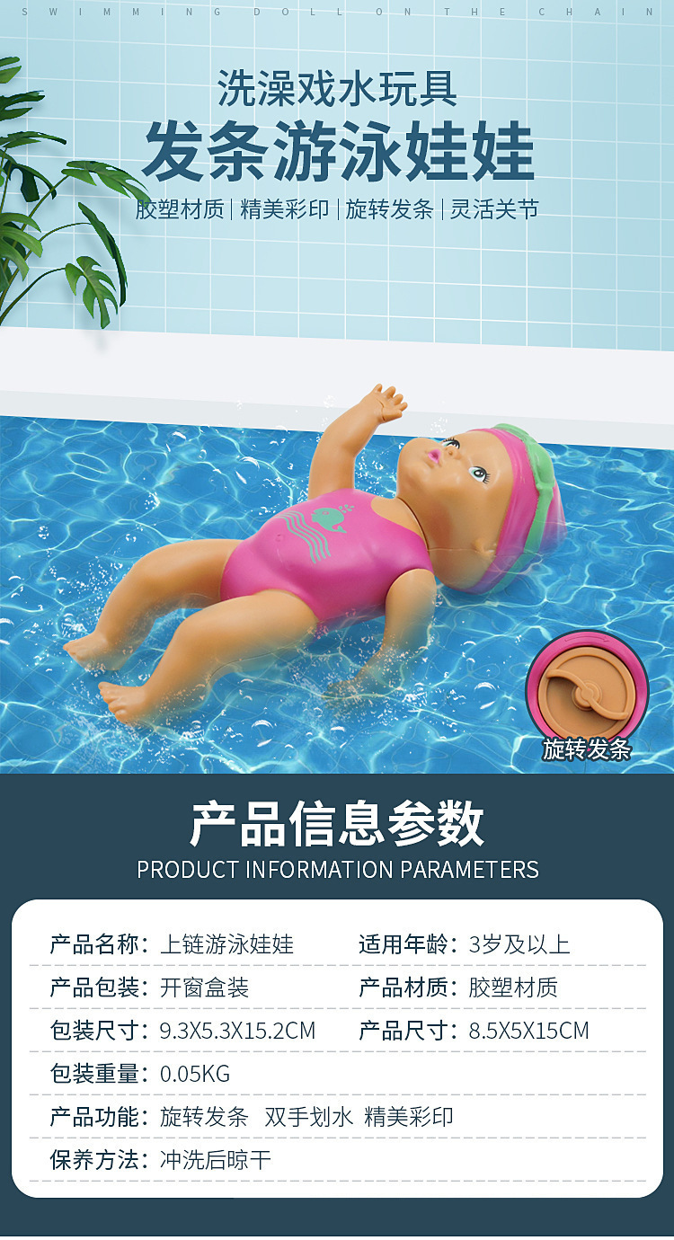 很可爱很萌的游泳娃娃,此产品将背部旋钮旋转,放入浴缸里,娃娃手臂将旋转拔动水,使其娃娃游动,一次性可以游20秒左右,当游水娃娃停止游动,从水面取出娃娃,将溢进娃娃里面的水将其通过漏水孔倒出,然后重新旋转背部按钮,再将娃娃放进浴缸里游动。