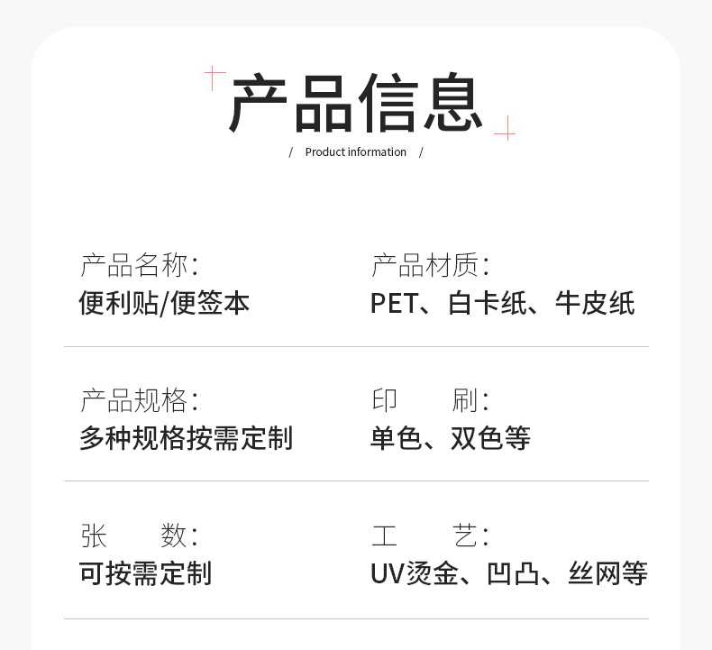 | Especificaciones | 7.6cm * 7.6cm 30 hojas por color Tamaño del paquete: 76*76*25MM Peso: 72g,7.5cm * 7.5cm 50 páginas por color Tamaño del paquete: 75*75*40MM Peso: 160g,6.5cm * 6.5cm 30 páginas por color Tamaño del paquete 65*65*20MM Peso: 30 gramos para un juego de dos juegos,7cm * 7cm 30 hojas por color Tamaño del paquete: 70*70*20MM Peso: 50 gramos para disparar un juego de dos juegos,7.6cm * 7.6cm 30 hojas por color Tamaño del paquete: 76*76*25MM Peso: 55g |