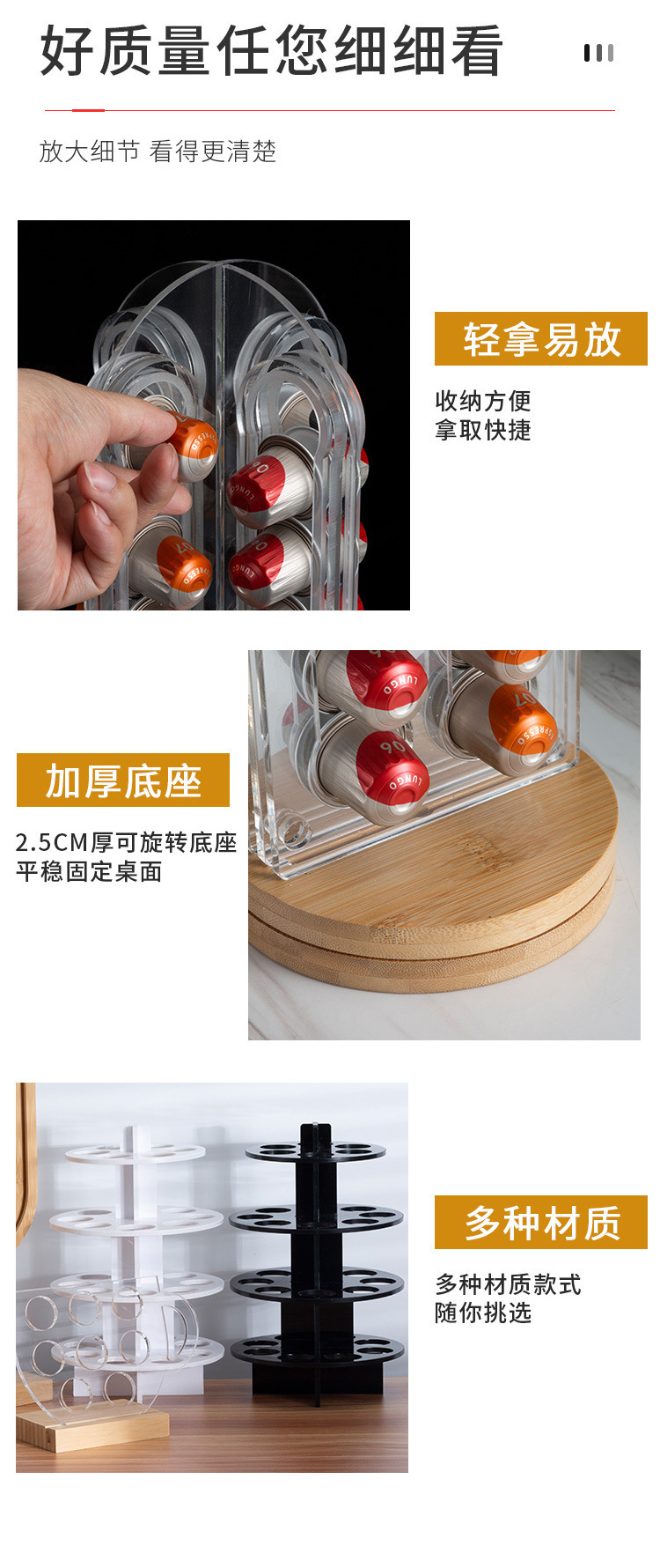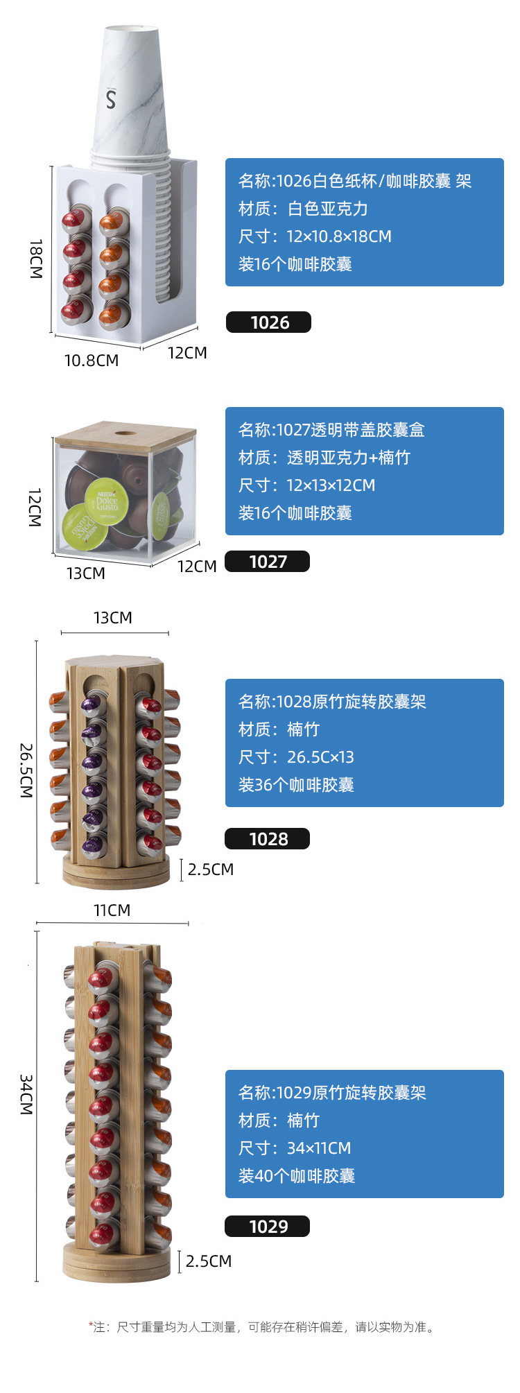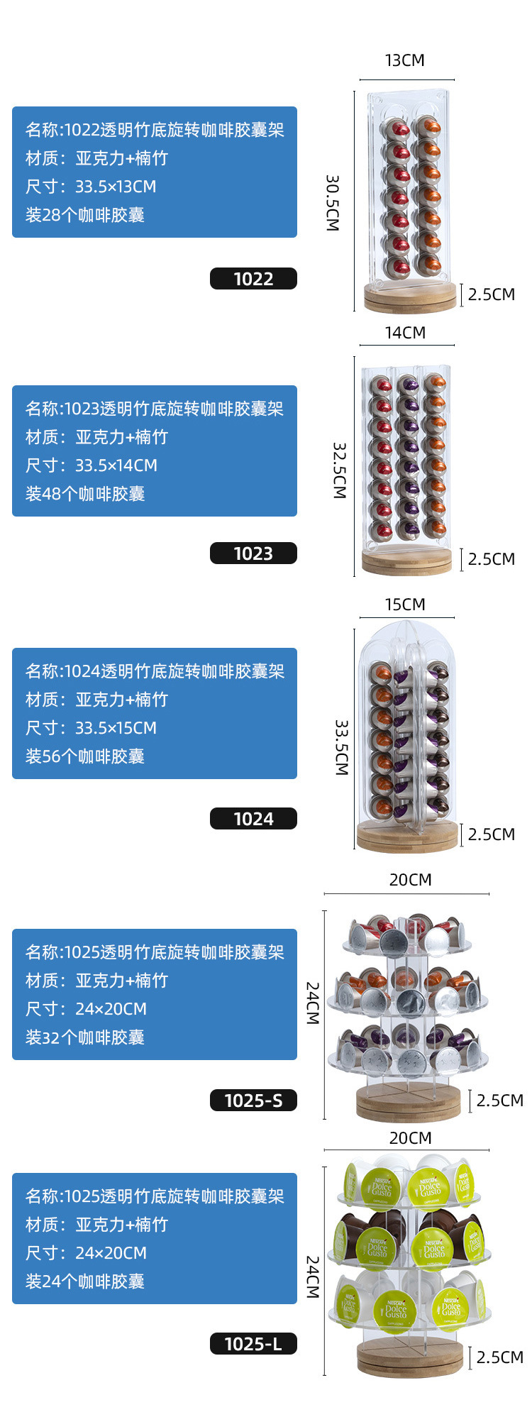 | Especificaciones | 1019-L taza soporte de cápsulas de café grande,1019-M taza soporte de cápsulas de café mediano,1019-S taza de café cápsula pequeña,1021B soporte de cápsulas de café tipo pastel negro,Soporte de cápsulas de café para pastel transparente 1021T,1021WH soporte de cápsulas de café tipo pastel blanco,1022 Soporte de cápsulas de café giratorio de fondo de bambú transparente,1023 Soporte de cápsulas de café giratorio con fondo de bambú transparente,1024 Soporte de cápsulas de café giratorio de fondo de bambú transparente,1025-L Soporte de cápsulas de café giratorio de fondo de bambú transparente,1025-S Soporte de cápsulas de café giratorio de fondo de bambú transparente,Soporte de cápsula de vaso de papel blanco,1027 caja de cápsulas transparente con tapa,1028 Soporte de cápsula giratorio de bambú crudo,1029 Soporte de cápsula giratorio de bambú crudo,1030 taza de papel soporte de cápsula dos en uno,1020 Soporte de café con cápsula en forma de árbol de bambú |