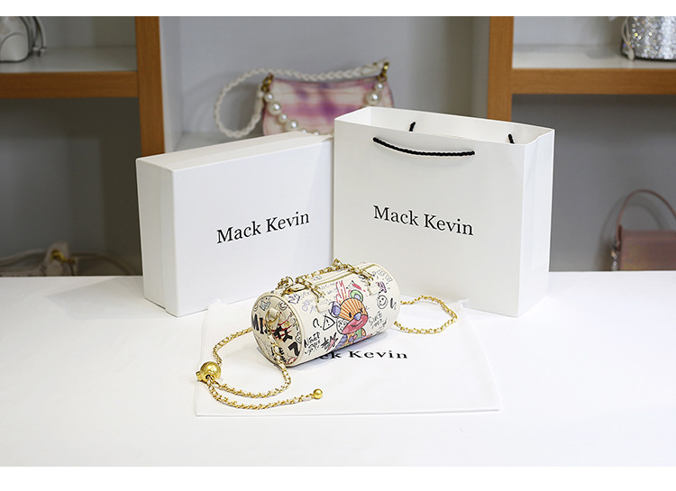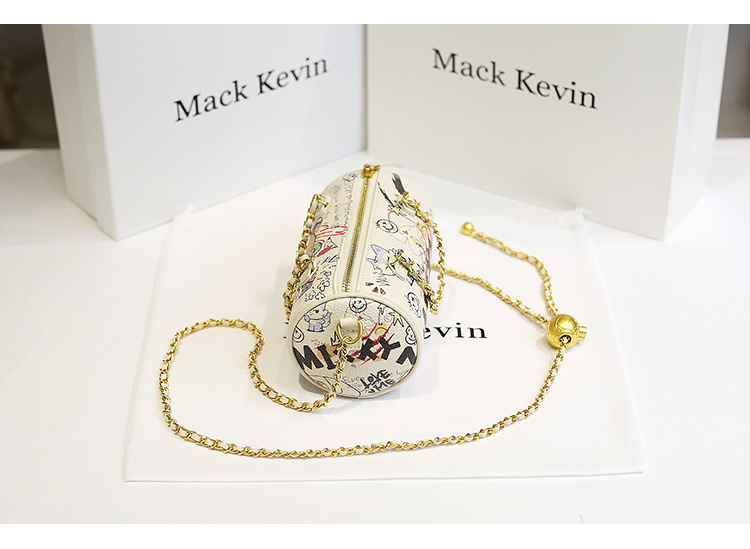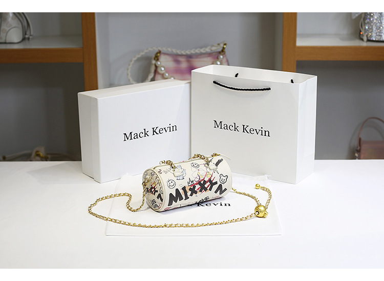 香港MackKevin真皮圆筒包包女2023新款小熊涂鸦链条包单肩斜挎包