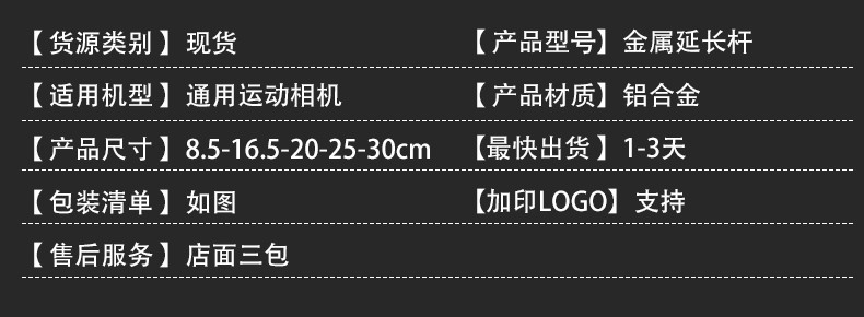 | Color | 8,5 cm,16,5 cm,20cm,25cm,30cm,</S>,16,5 cm + tornillo,20cm + tornillo,25cm + tornillo,30cm + tornillo,8,5 + tornillo + adaptador,16,5 cm + tornillo + adaptador,20cm + tornillo + adaptador,25cm + tornillo + adaptador,30cm + tornillo + adaptador,1/4 cabeza femenina,1/4 macho |