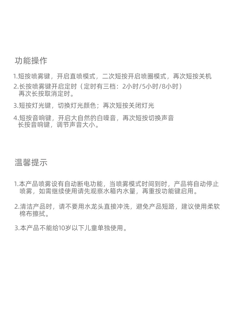 | Función | Humidificación,Aromaterapia,Temporización,Atomizador,Onda ultrasónica,Mudo,Iluminación,Fragante |