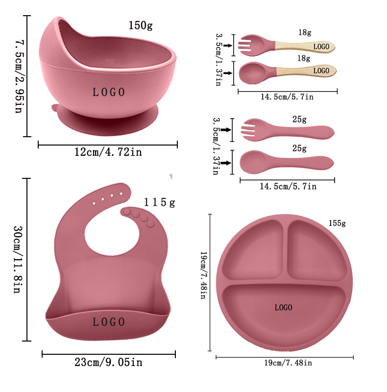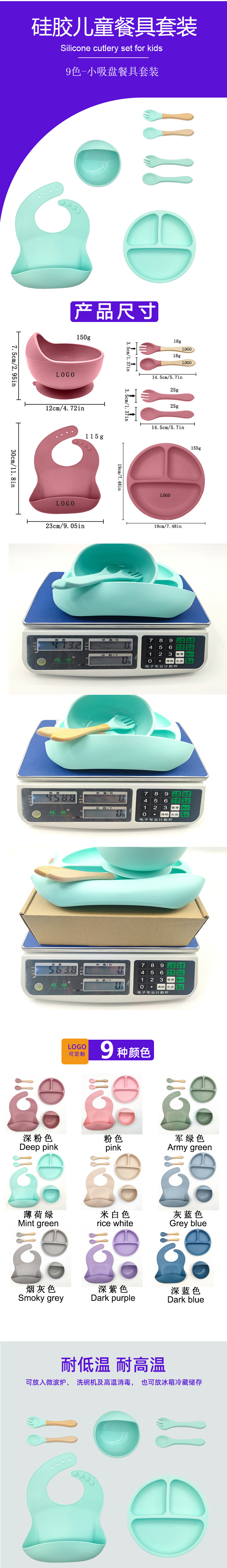 【产品重量】:围兜115g,小吸盘155g,碗150g,吸管杯93g,硅胶叉/勺25g,