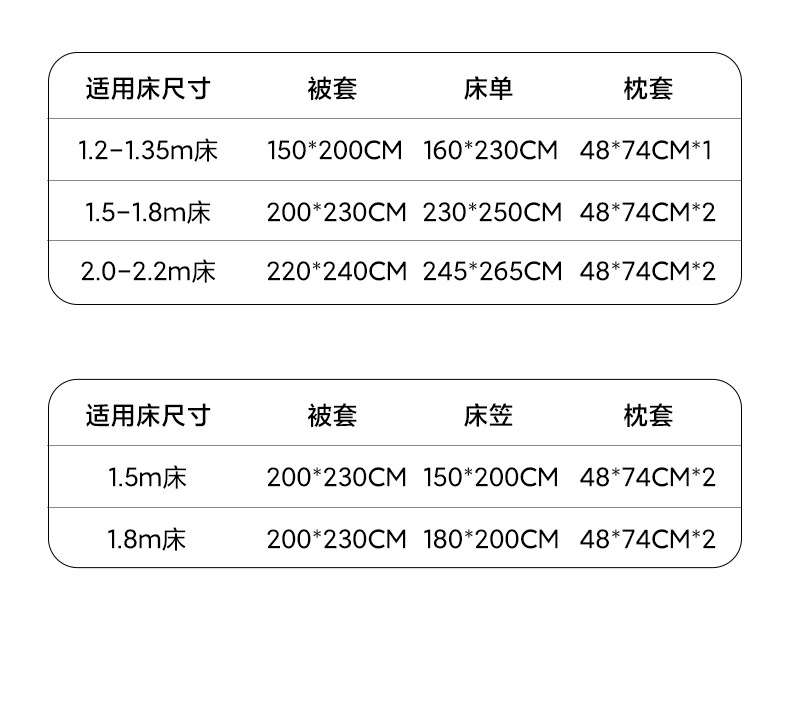 | Especificaciones de tamaño | Juego de sábanas de tres piezas de 0,9-1,2 m (funda de edredón 150*200 sábanas 160*230 funda de almohada 48*74),Juego de cuatro piezas de ropa de cama 1.5-1.8m (funda de edredón 200*230 sábana 230*24 funda de almohada 48*74*2),Juego de cuatro piezas de 2m sábanas (funda edredón 220*240 sábanas 240*270 funda de almohada 48*74*2),Juego de cuatro piezas de 1,5 sábanas (funda edredón 200*230 sábanas 150*200 funda de almohada 48*74*2),Juego de cuatro piezas de cama de 1,8m (funda de edredón 200*230 funda de almohada 180*200) |