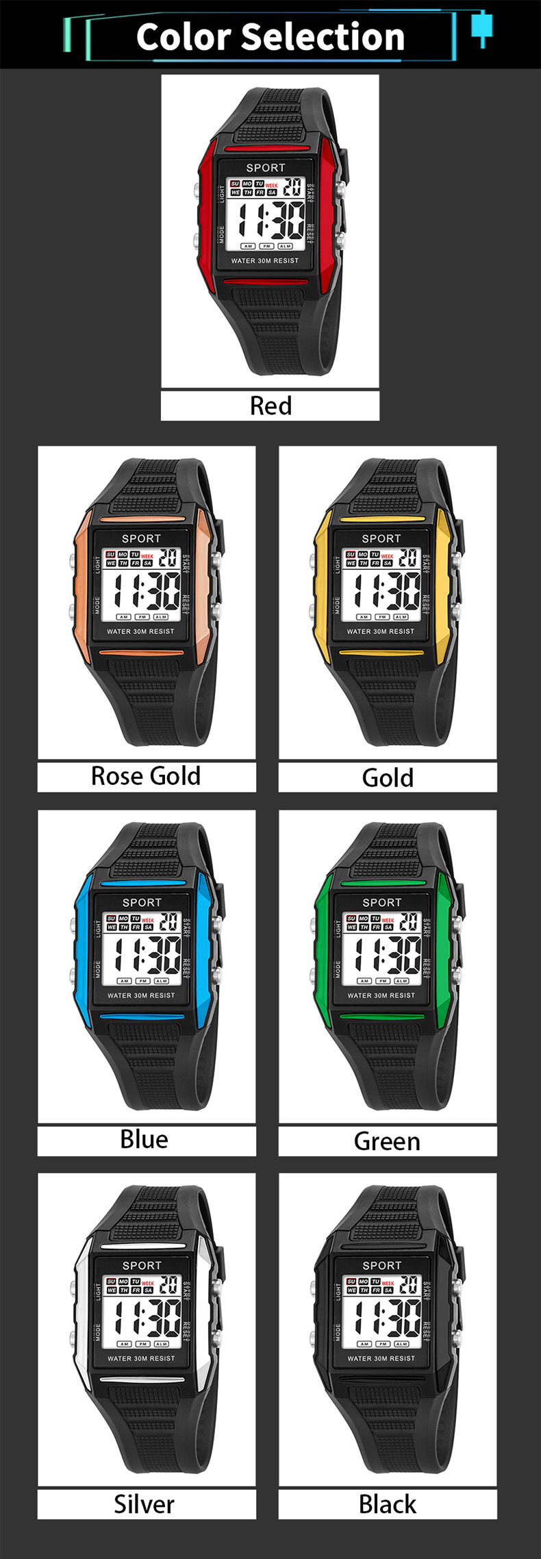 | Color | Rojo, oro rosa, oro, azul, verde, plata, negro |