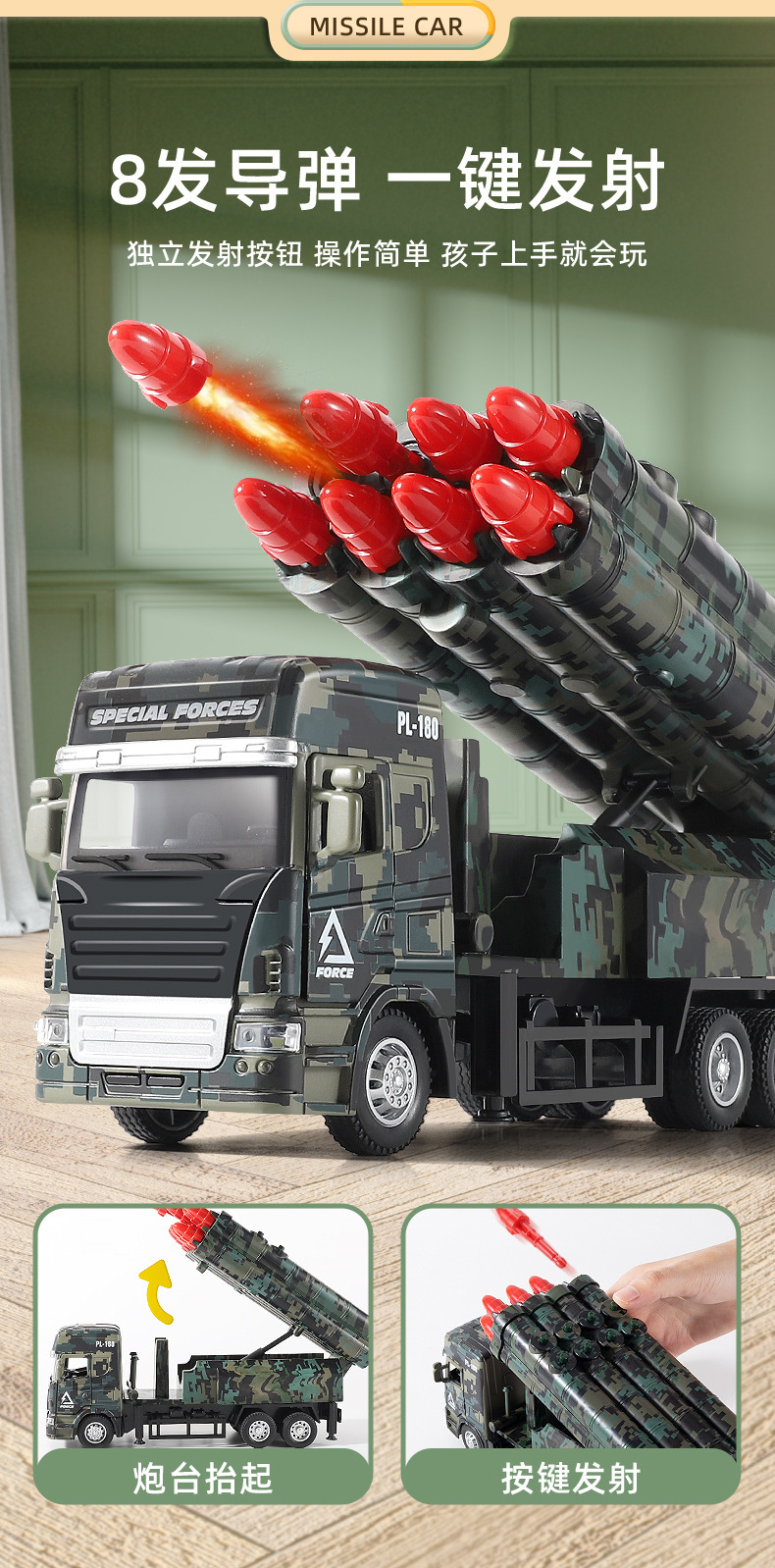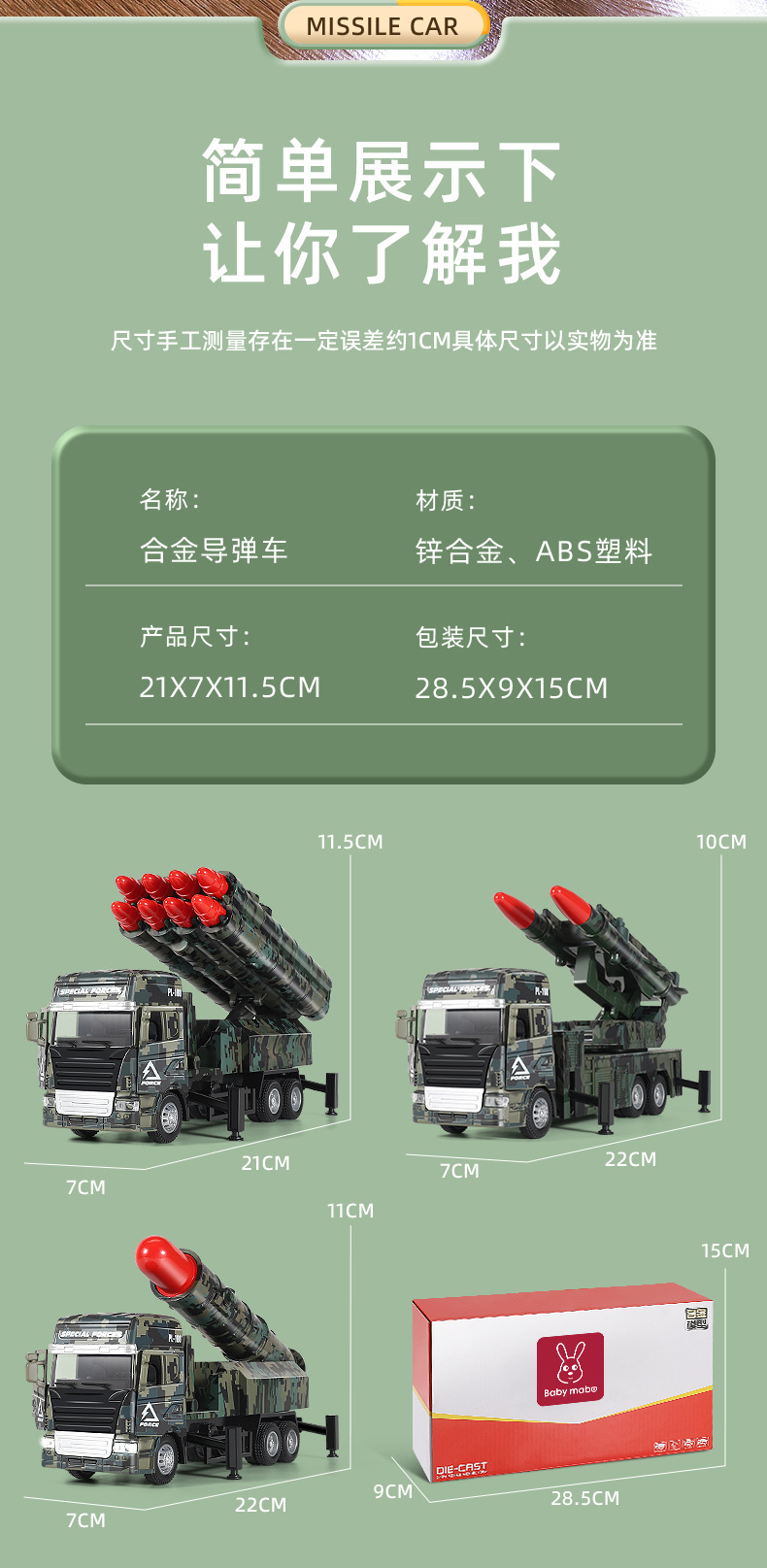 | Colores | 1:32 Vehículo de lanzamiento de misiles dobles [en caja-verde],1:32 Vehículo de lanzamiento de ocho bombas [en caja-verde],Camiseta elevadora 1:32 [en caja-verde],[Aleación de 6 rondas] Coche de misiles (la puerta se puede abrir),[Aleación única] Coche de misiles guiados (la puerta se puede abrir) |