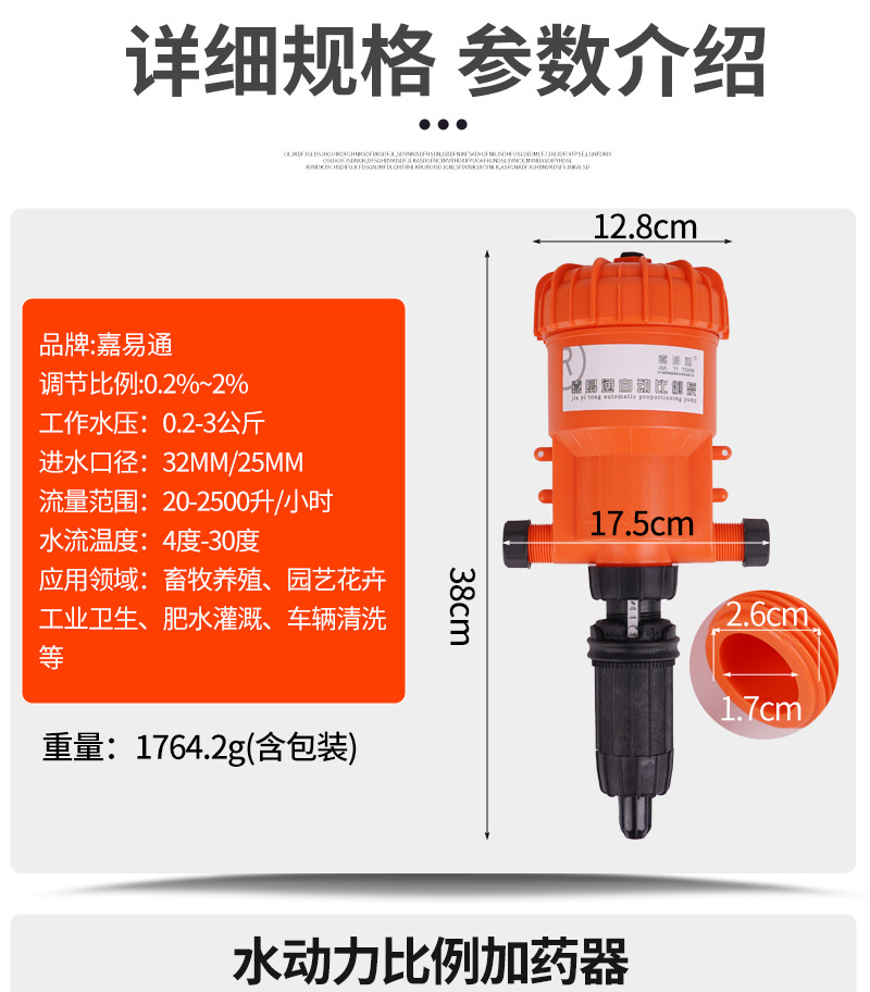 | Especificaciones del producto | Medicinador 0.2%-2%,Medicinador de 0,4%-4%,1%-5% dispositivo de medicación,Dosificador P2501 (0,1%--0,9%),Dosificador P2502 (0,2%--2%),Dosificador P2505 (1%--5%),Dosificador P2510 (3%--10%),Dosificador P2521 (5%--21%),Amedicador Jialebao (0,2%-2%),Dispositivo de medicina Jialebao (1% --- 6%),Dosificador P2501 (0,1%--0,9%) + prefiltro,Dosificador P2502 (0,2%--2%) + prefiltro,Dosificador P2505 (1%--5%) + prefiltro,Dosificador P2510 (3%--10%) + prefiltro,Dosificador P2521 (5%--21%) + prefiltro,Amedicador Jialebo (0,2%-2%) Prefiltro,Amedicador Jialebo (1%-6%) Prefiltro |