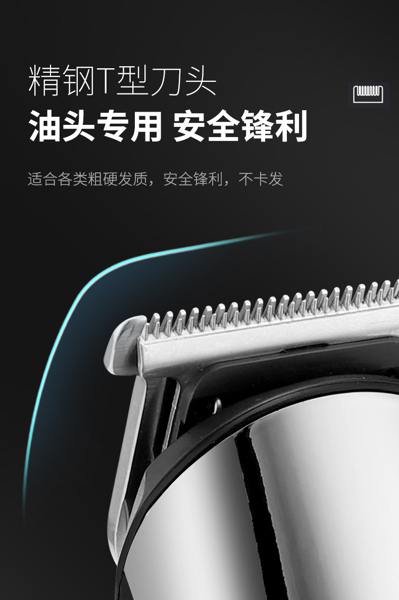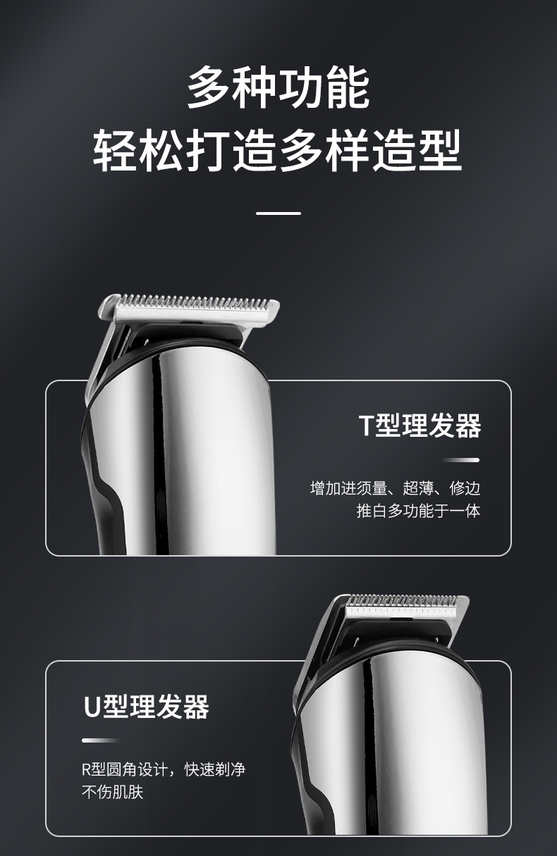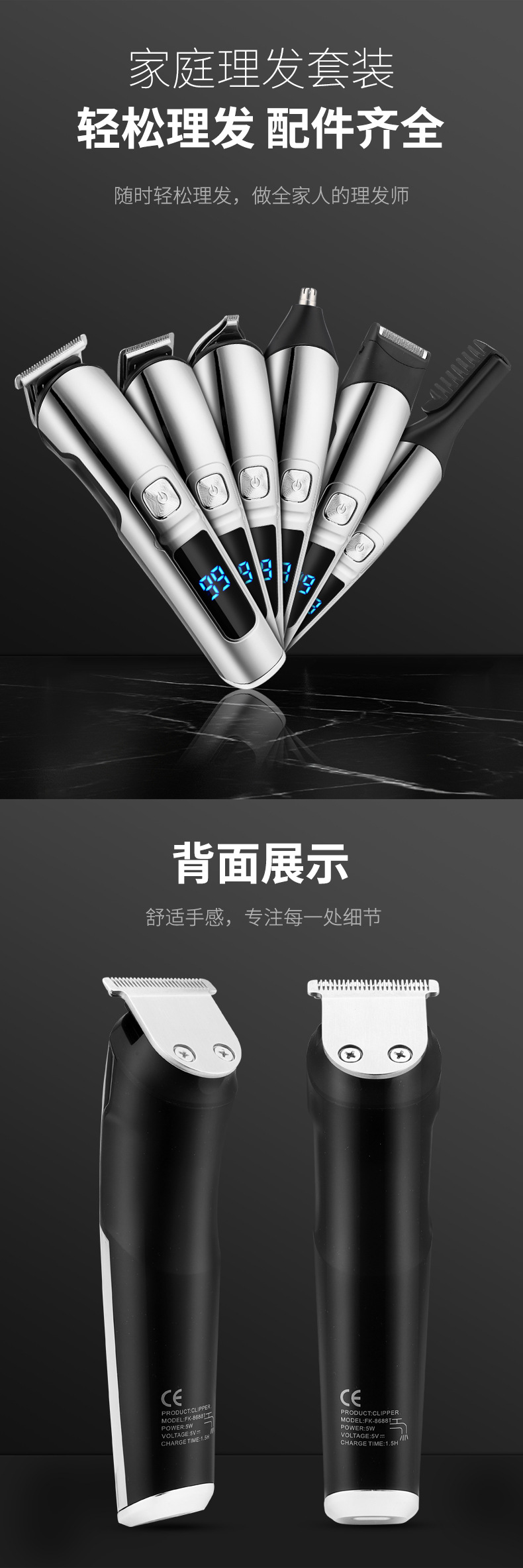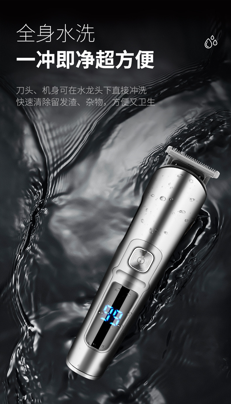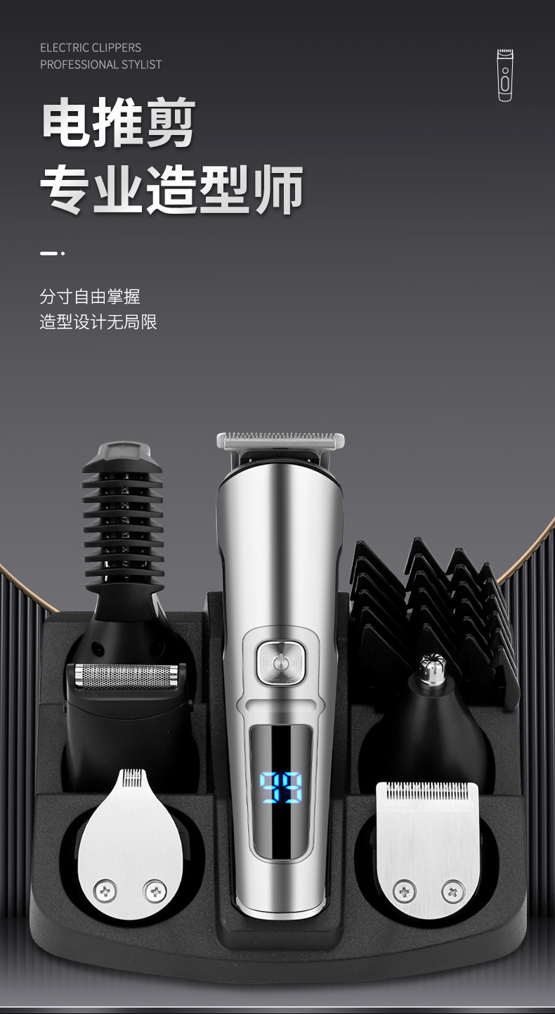 产品特点:液晶电量显示、机身全身水洗、6合1换头电推剪、2档动力调节;