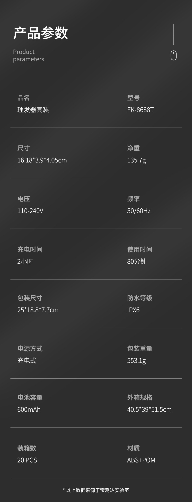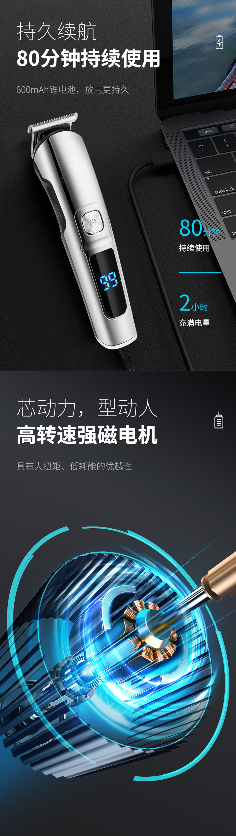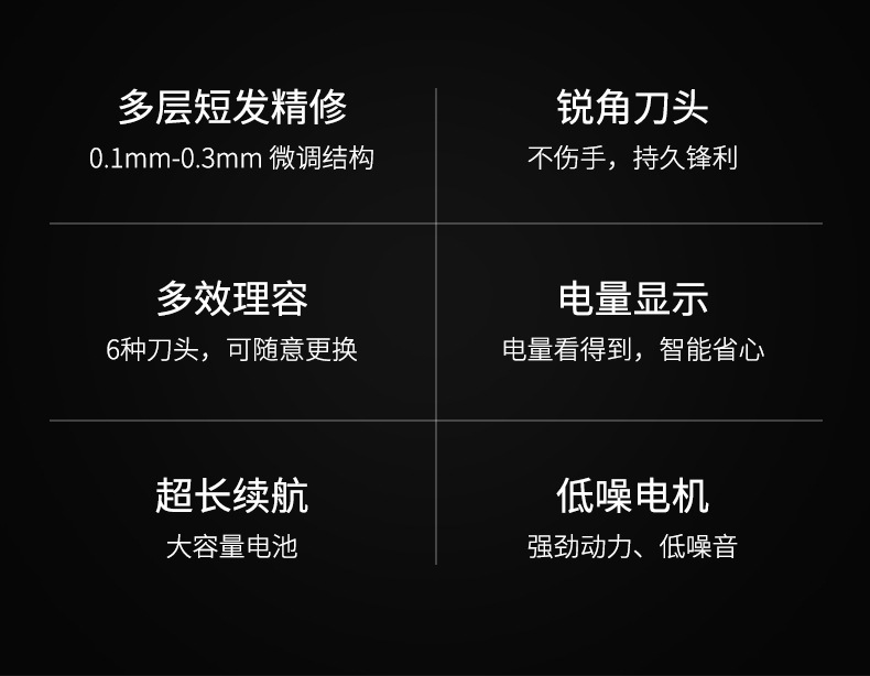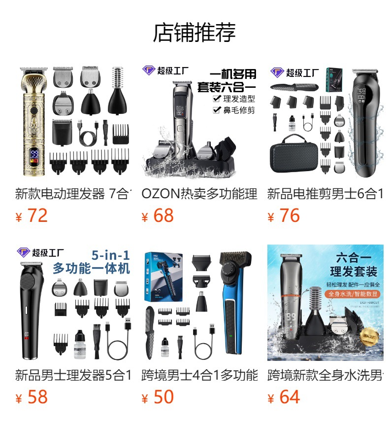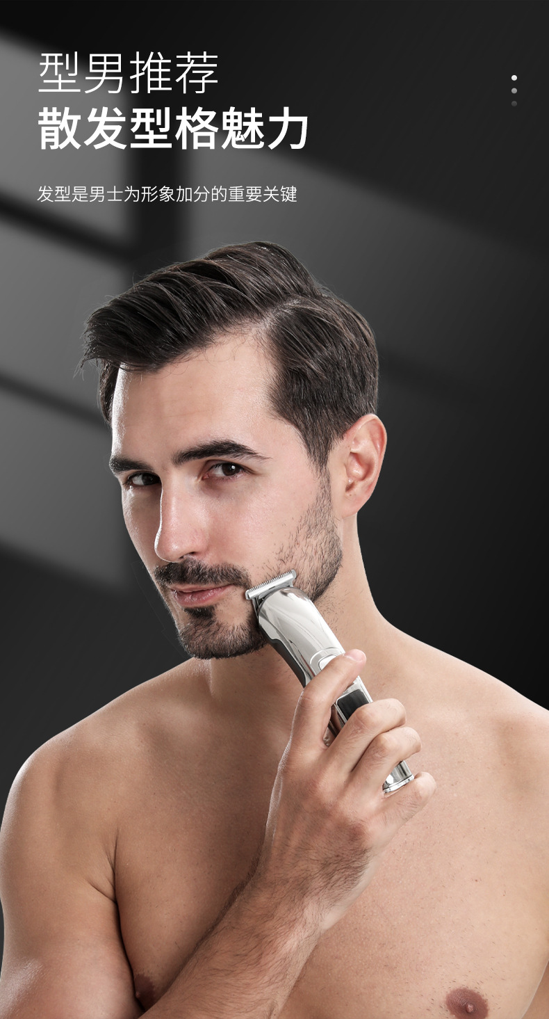 产品特点:液晶电量显示、机身全身水洗、6合1换头电推剪、2档动力调节;