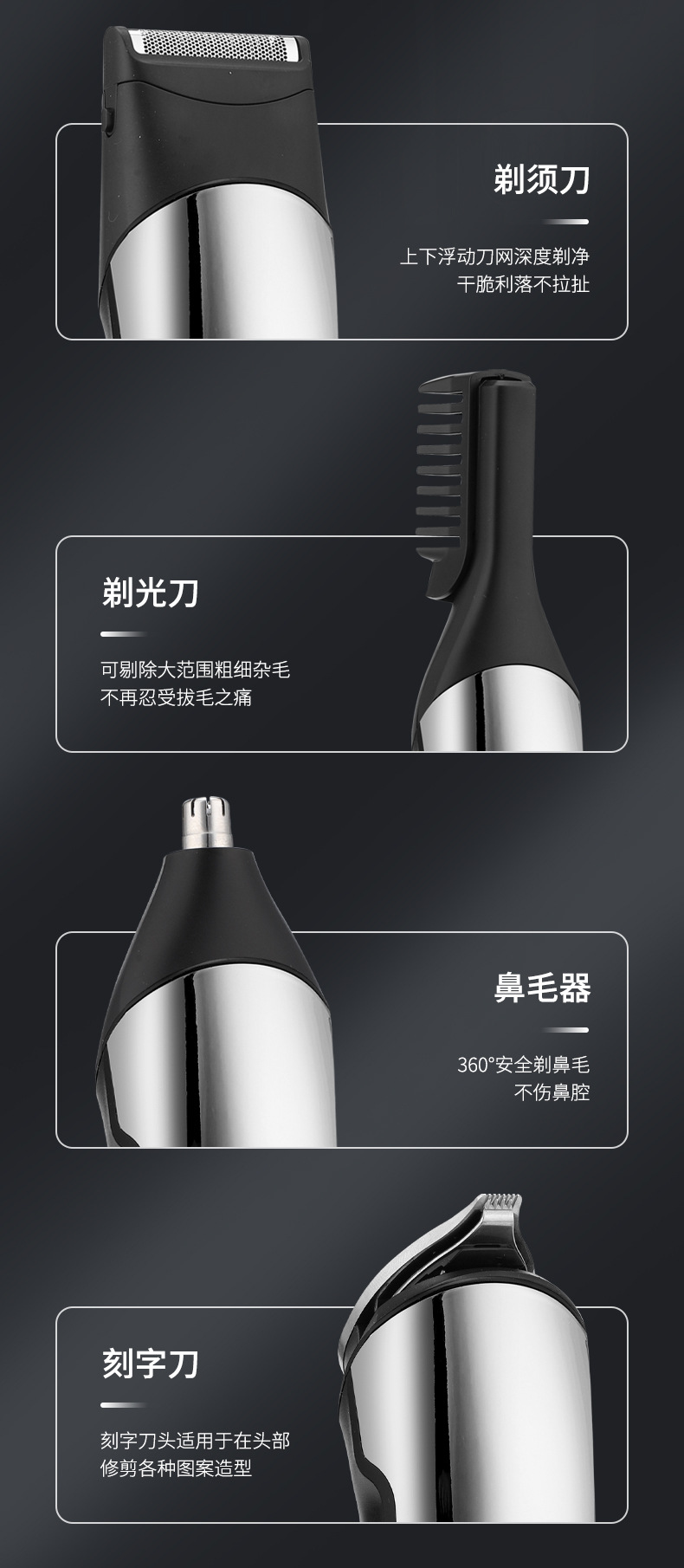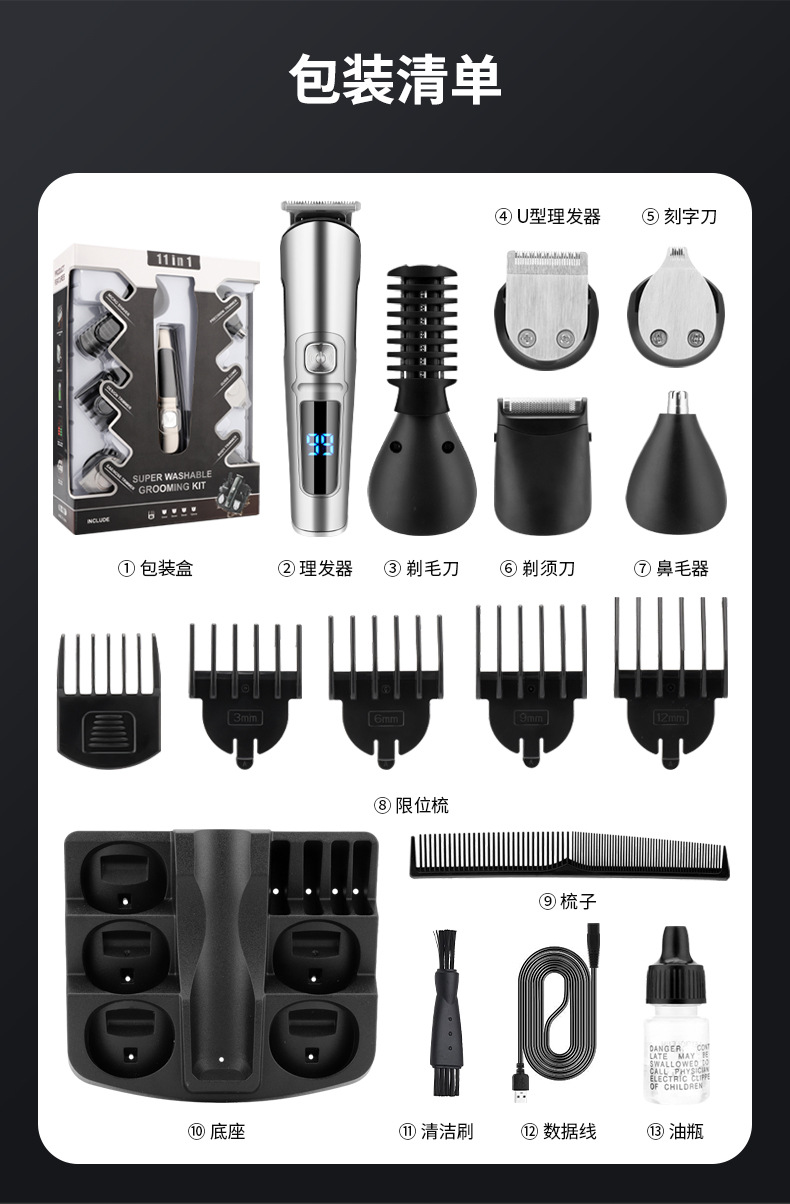 产品清单:主机+理发刀头+精修刀头+雕刻刀头+鼻毛修建刀头+剃须刀头+修眉刀头+限位梳*4(3.6.9.12mm)+精修刀头限位梳+收纳盒+梳子+清洁刷+USB充电线+英文说明书.