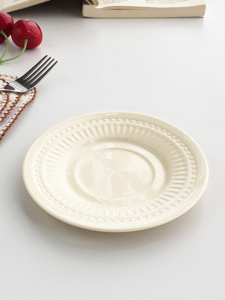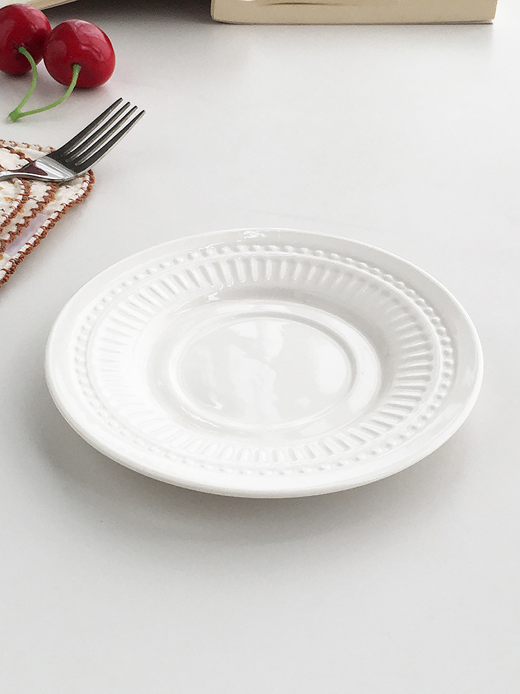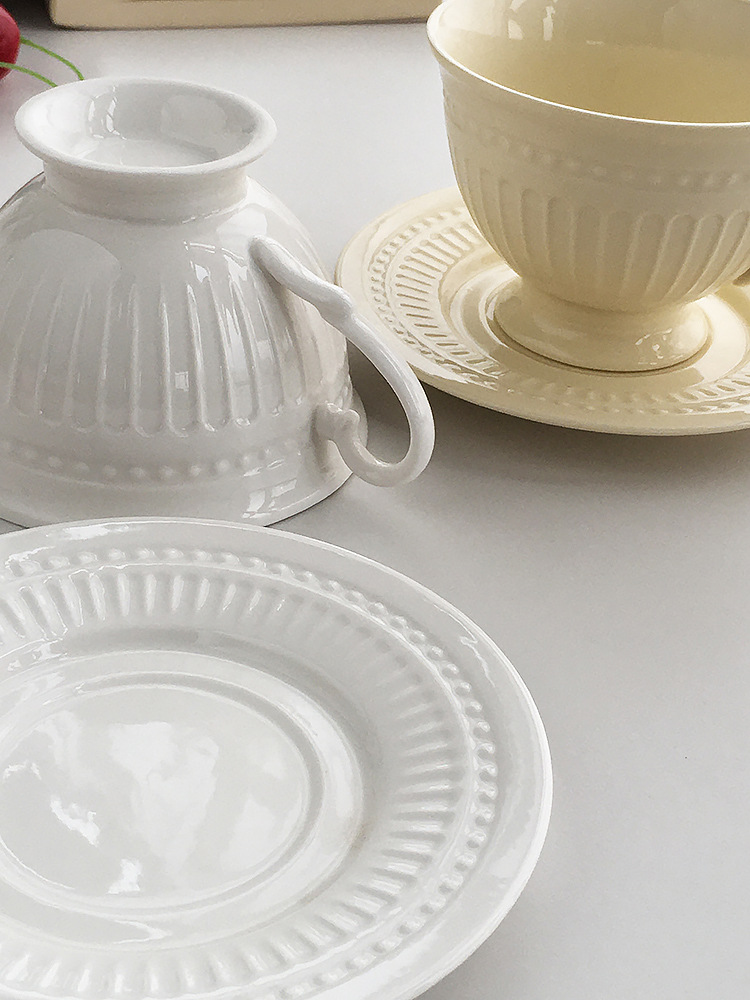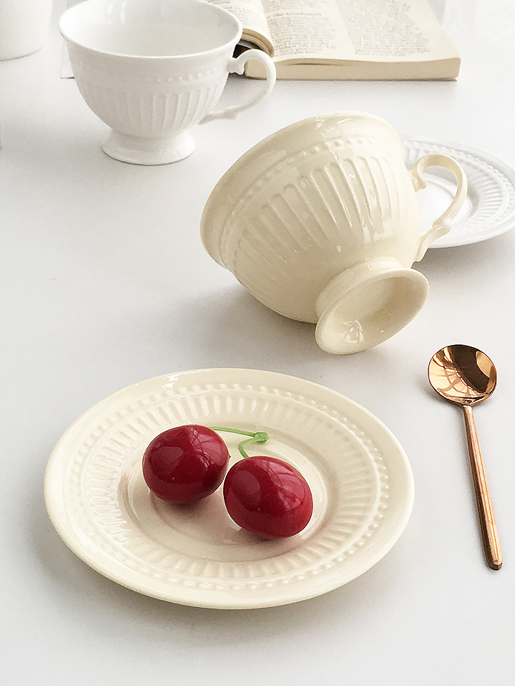 Gran fábrica al por mayor pedidos franceses puntos de cuentas en relieve cerámica tazas de café platos de refrigerio de la tarde platos