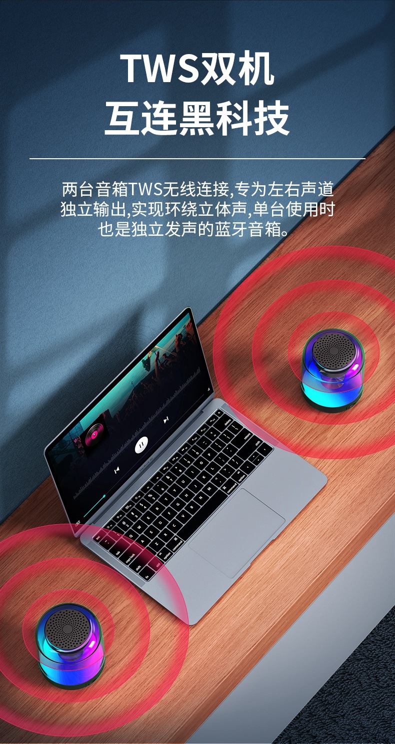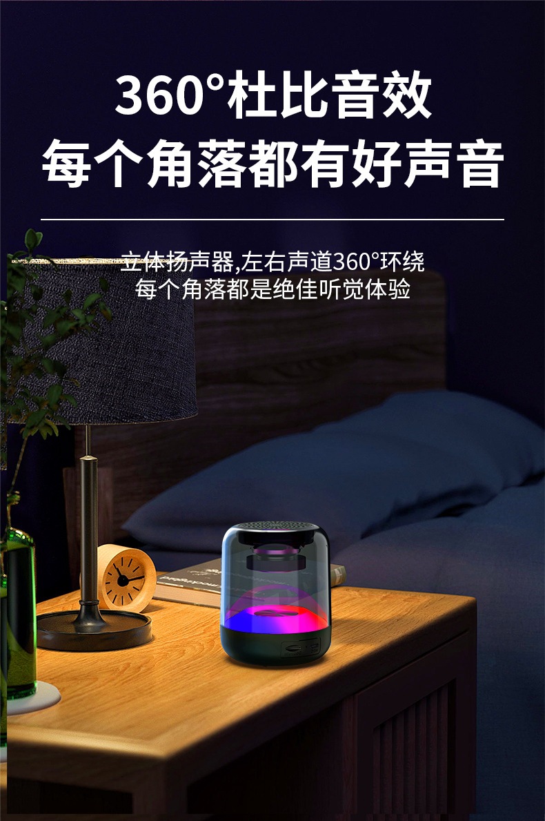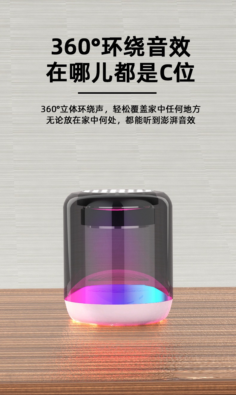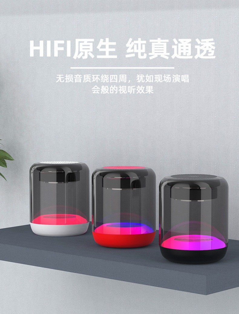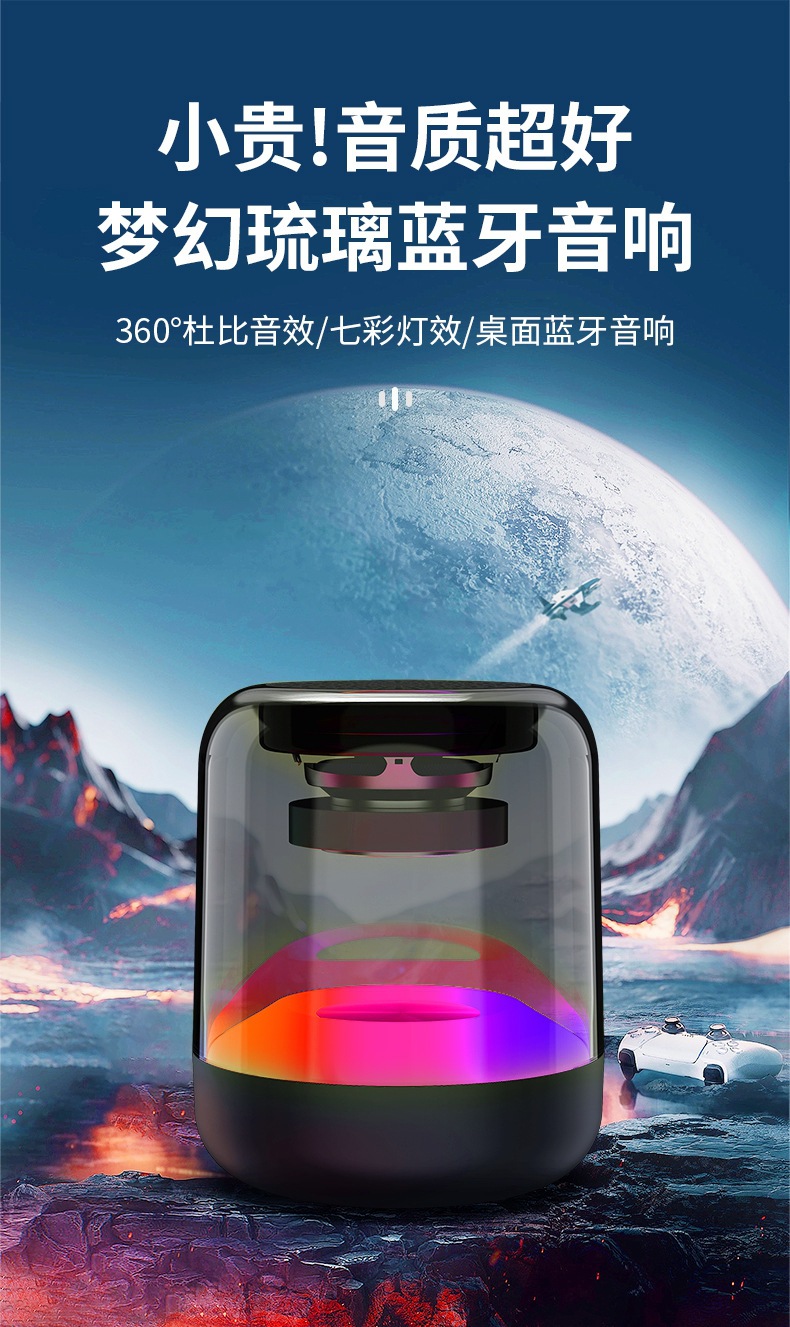 七彩琉璃蓝牙音箱,卖点:随声音闪烁七彩灯,500毫安大容量电池,长续航,带FM收音机,也可以插卡放歌,内置高灵敏麦克风可以手机蓝牙免提通话,两个音箱可以互连作为对箱使用。