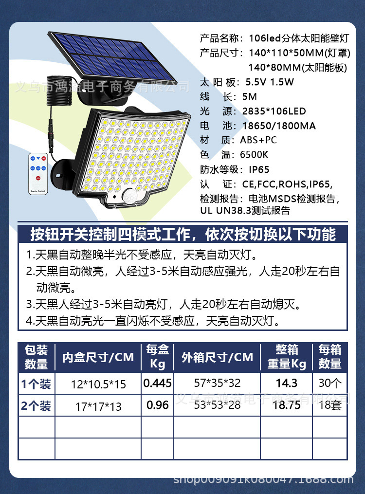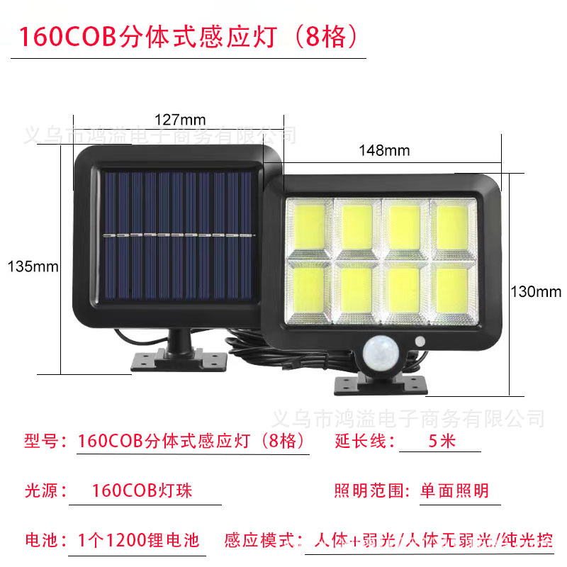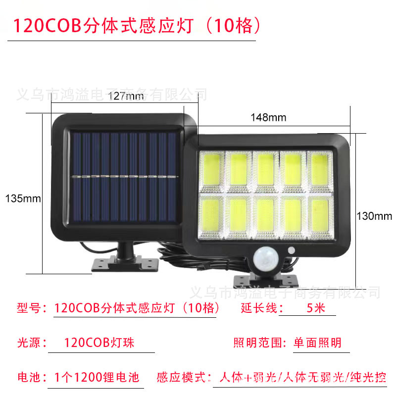 | Clasificación de especificaciones | Energía solar de inducción dividida 120COB (1 cuadrícula) tres modos sin control remoto,Sensor split solar 108COB (2 rejillas) tres modos sin mando a distancia,Sensor split solar 128COB (4 celdas) tres modos sin mando a distancia,Sensor split solar 120COB (6 celdas) tres modos sin mando a distancia,Sensor split 56LED sin mando a distancia |