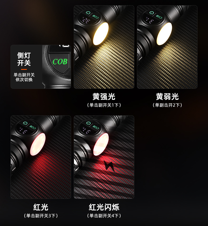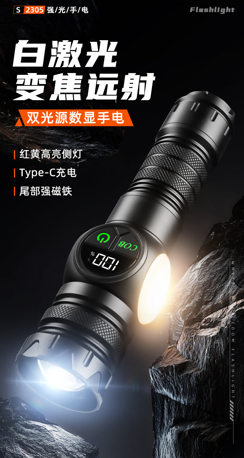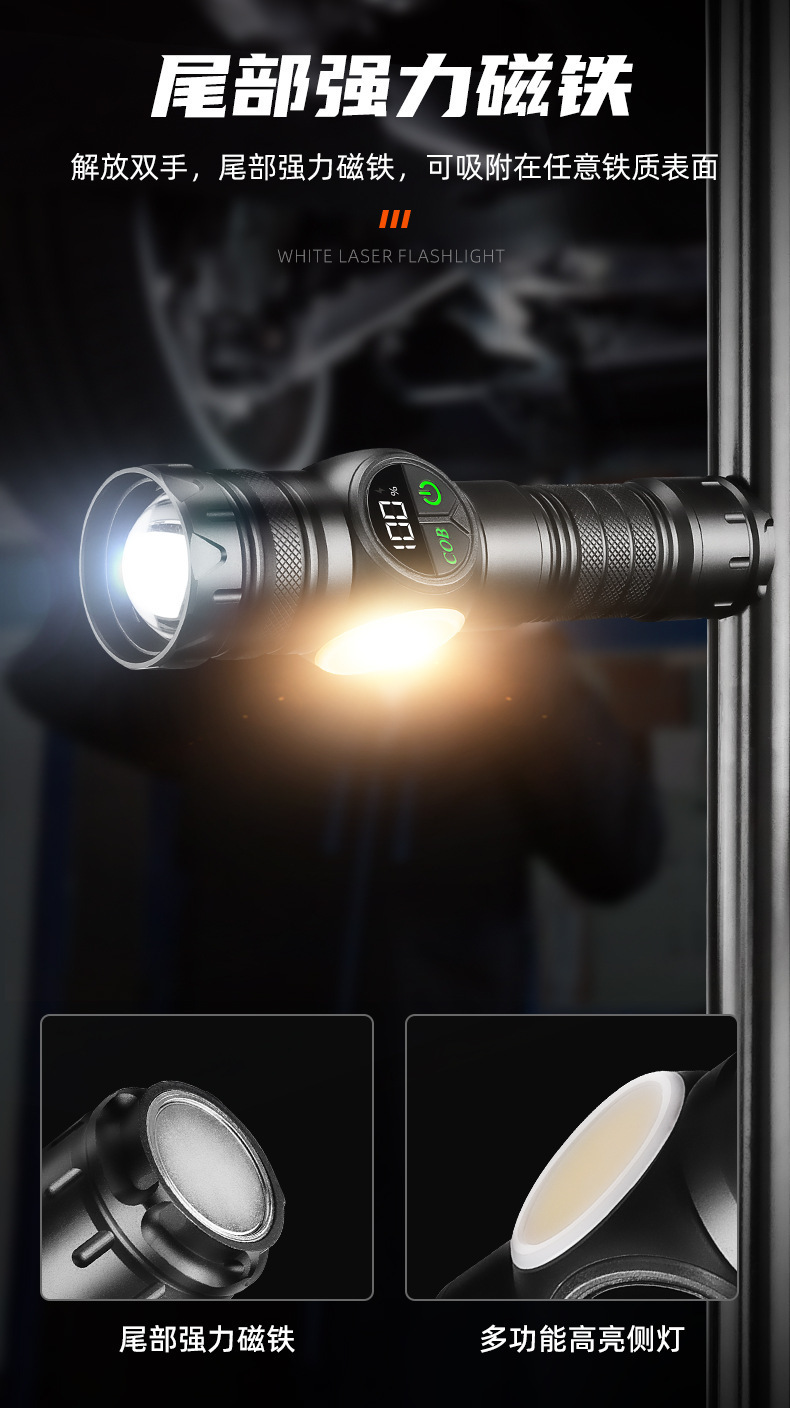 特点:带COB侧灯 独立式按压开关 带数显 尾部带磁铁指示灯数字百分比LED电量显示 充电时数显处绿色闪电标闪