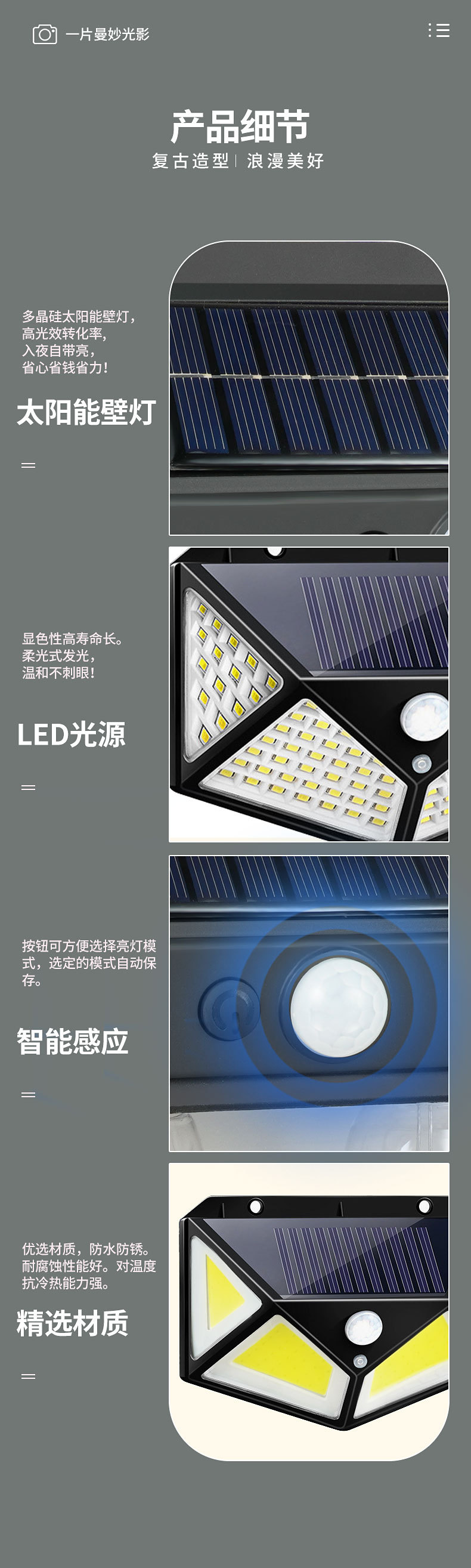 | Clasificación de especificaciones | 20LED-Tres funciones,30LED-Tres funciones,30LED-Función única-Detección del cuerpo humano,48COB-Tres funciones,100LED-Tres funciones,100COB-Tres funciones,114LED-Tres funciones (2 baterías),212LED-Tres funciones |