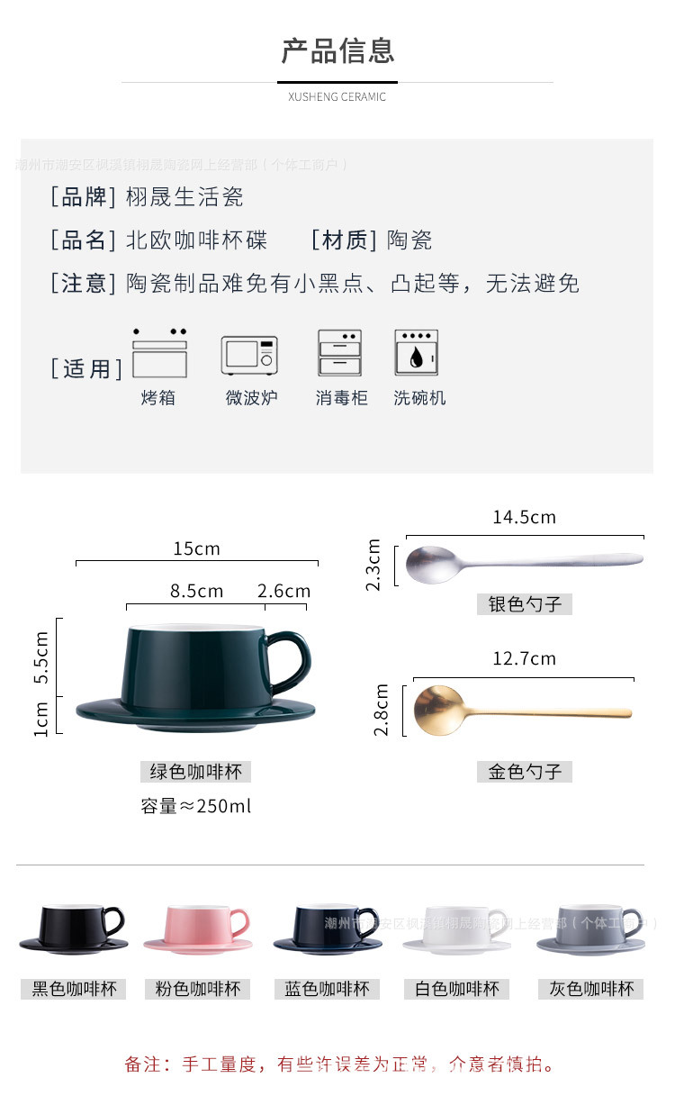 | Color | Verde oscuro (1 taza, 1 plato, 1 cucharada), gris claro (1 taza, 1 plato, 1 cucharada), negro (1 taza, 1 plato, 1 cucharada), blanco (1 taza, 1 plato, 1 cucharada), azul tesoro (1 taza, 1 plato, 1 cucharada), rosa (1 taza, 1 plato, 1 cucharada) |
