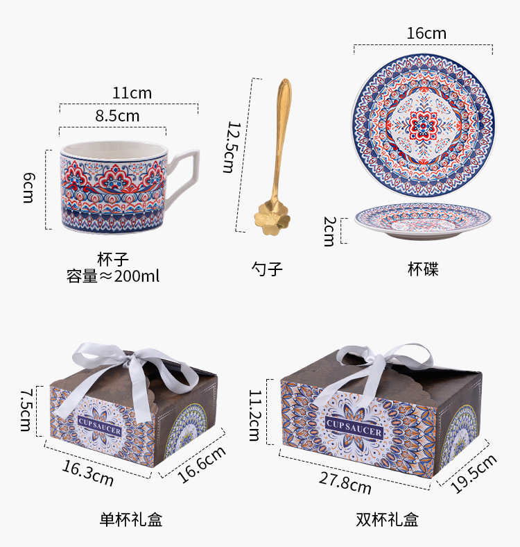 | Colores | Caja de regalo de Melbourne 1 taza 1 disco,Caja de regalo de lunares 1 taza 1 caja de regalo de disco,Bohemia Una caja de regalo de 1 taza y 1 plato,Caja de regalo Bohemia B 1 taza 1 plato,Caja de regalo Bohemia C 1 taza 1 plato,Caja de regalo Bohemia D 1 taza 1 plato,Mapa de dimensiones |