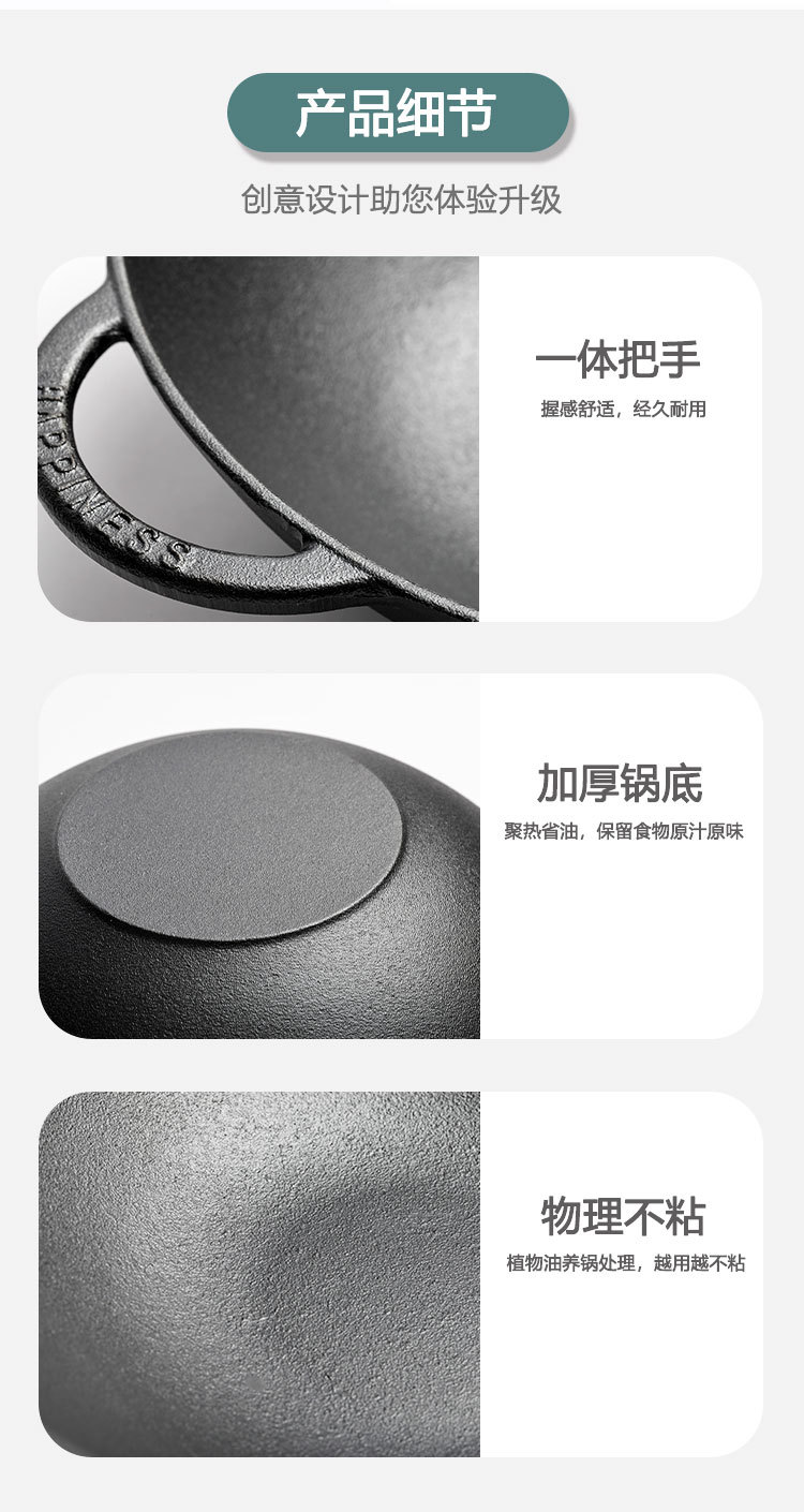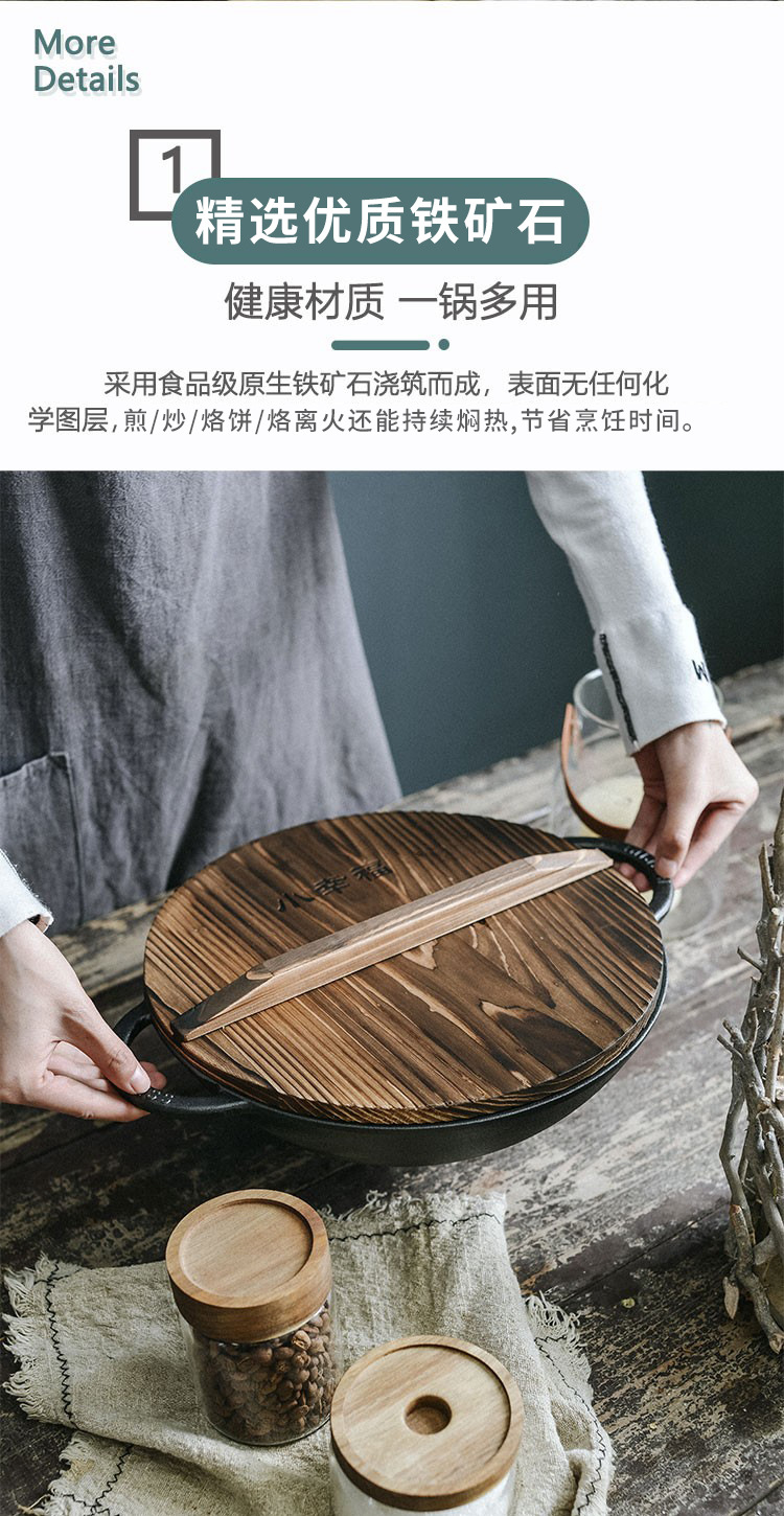 Pequeña felicidad 30cm wok hogar de hierro fundido solo wok tradicional engrosada sartén de hierro fundido sin recubrimiento físico sartén antiadherente