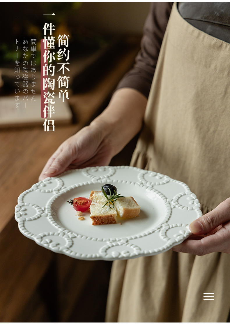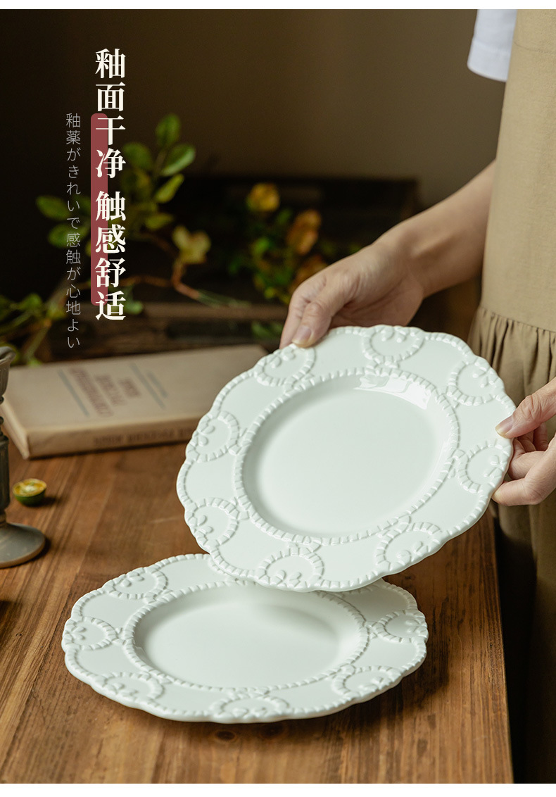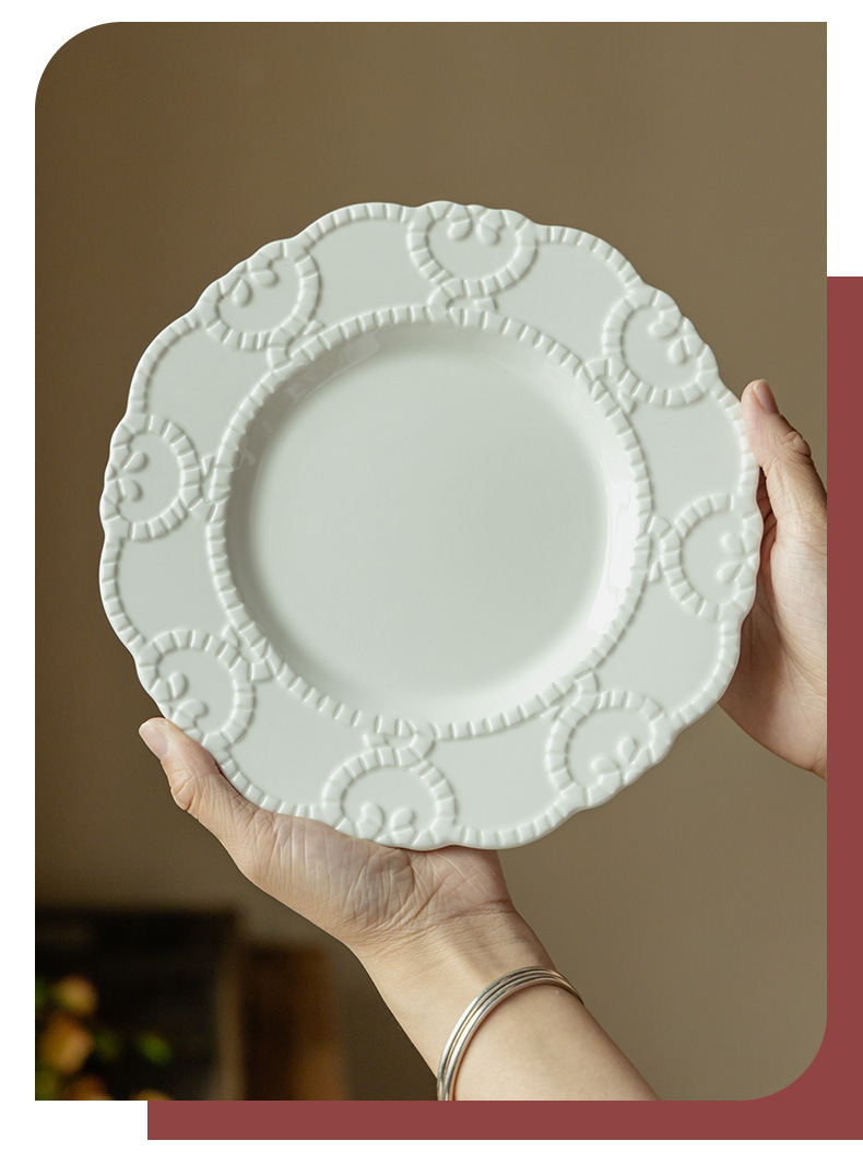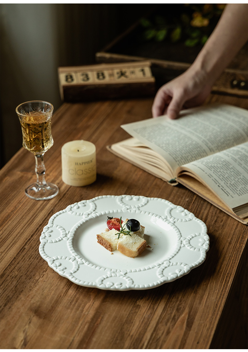 Plato de cerámica en relieve francés, plato de encaje, plato de postres de restaurante de alto nivel, plato creativo para el hogar, plato diario