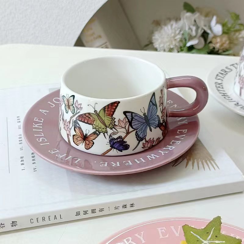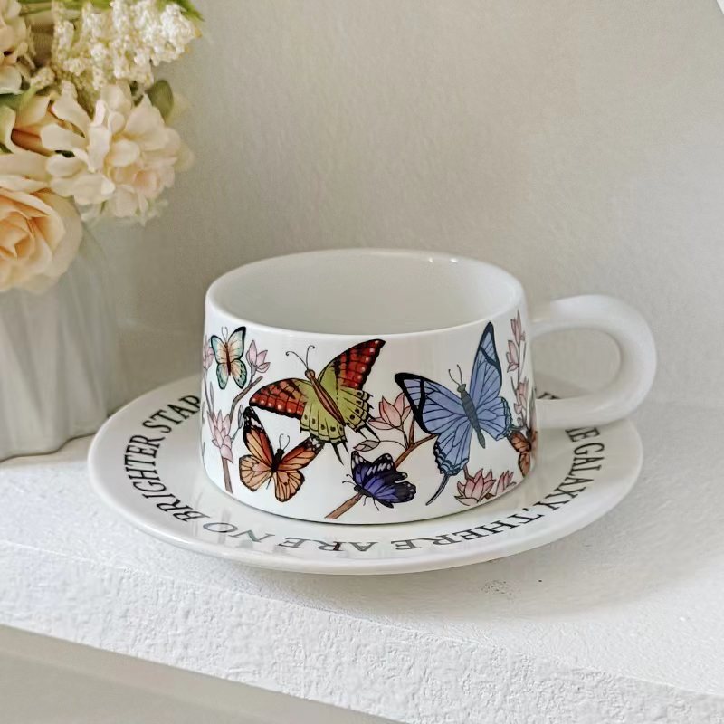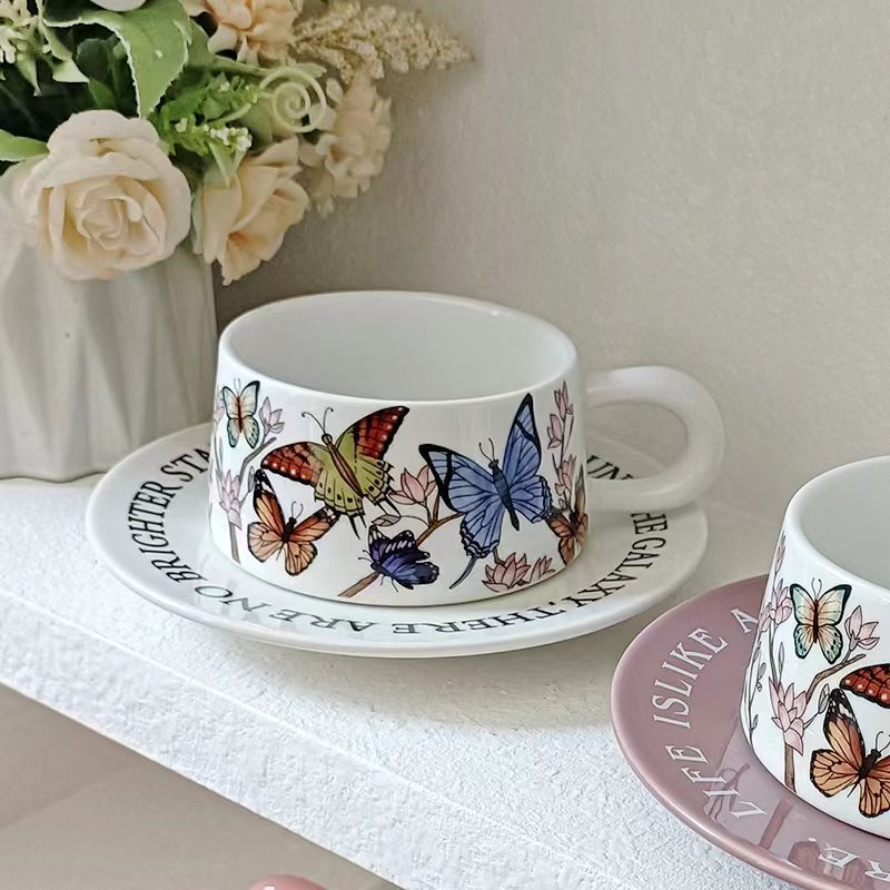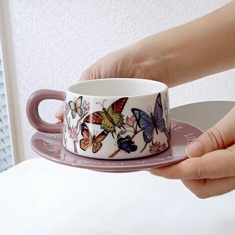 | Color | Una taza de mariposa púrpura, una taza de mariposa blanca, un plato |
