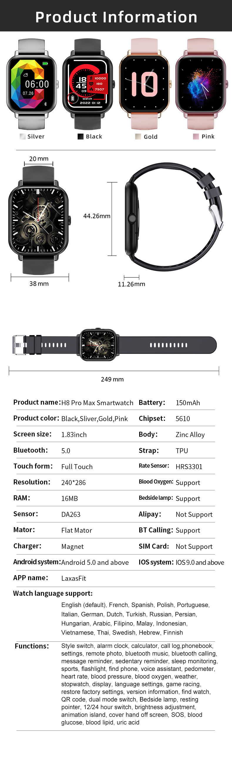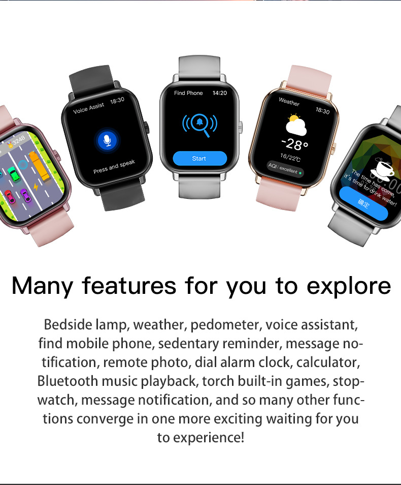 | Función | Fotografía, contador de pasos, monitoreo de frecuencia cardíaca, medición de presión arterial, entretenimiento social, medición de temperatura corporal, llamada bluetooth, recordatorio inteligente, selfie remoto, monitoreo del sueño, detección de oxígeno en sangre |