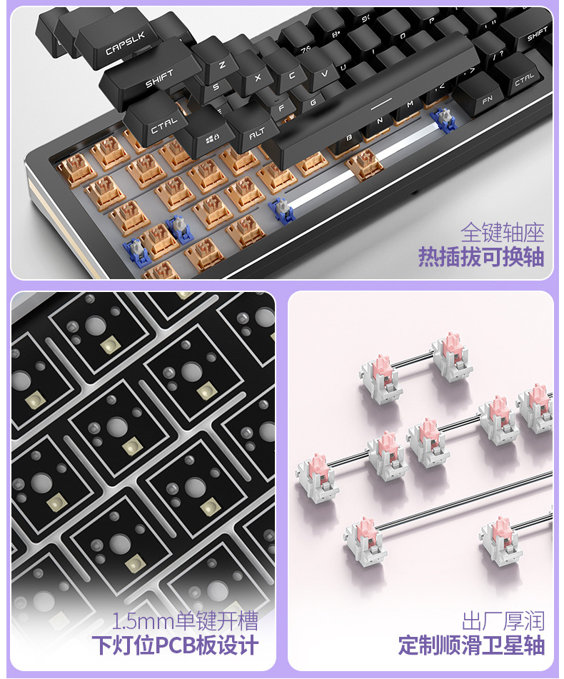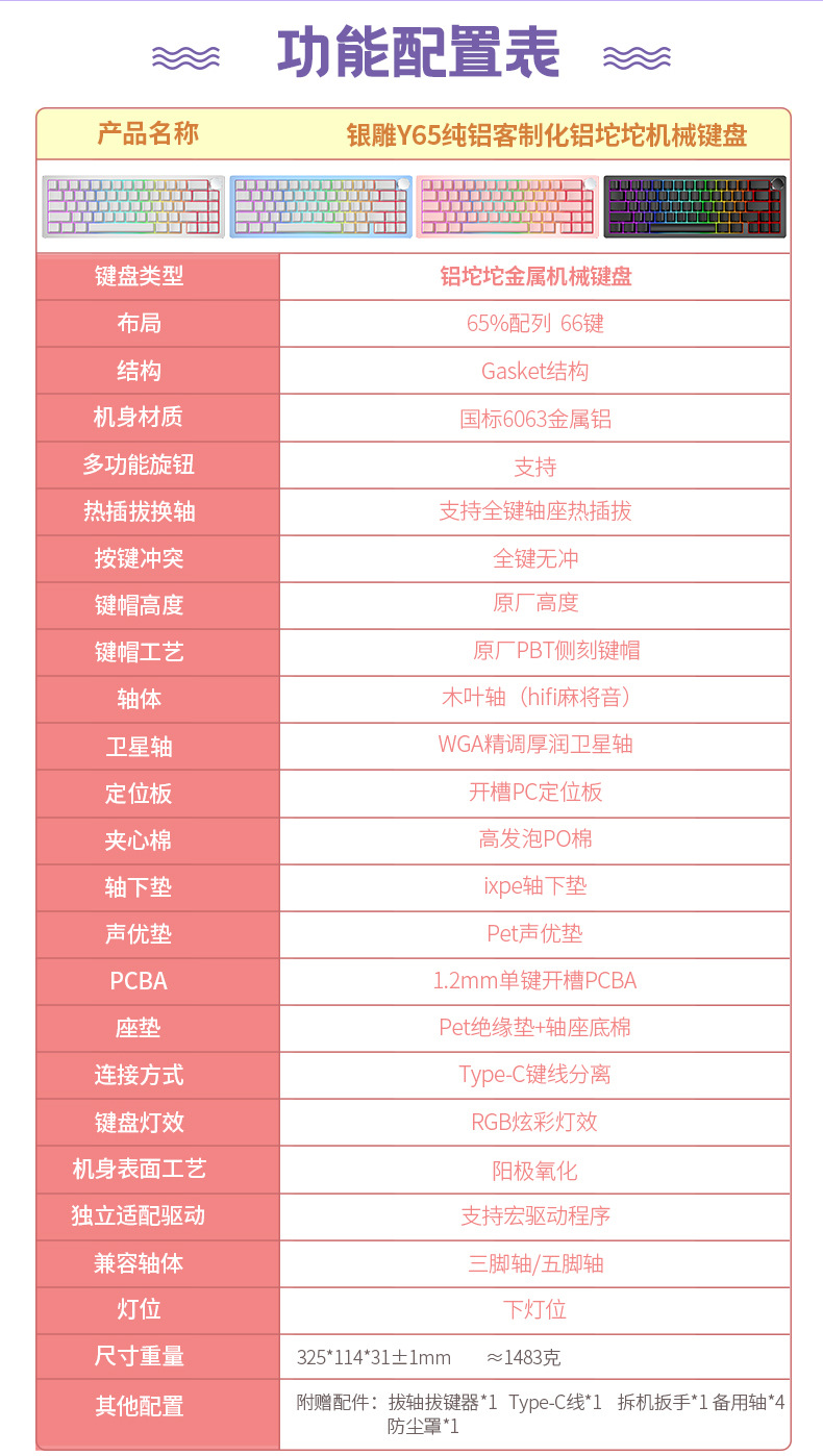 | Lista de embalaje | Teclado * 1 extractor de llave * 1 llave de desmontaje * 1Type-C cuerpo del carrete * 4 cubierta antipolvo * 1 manual * 1 |