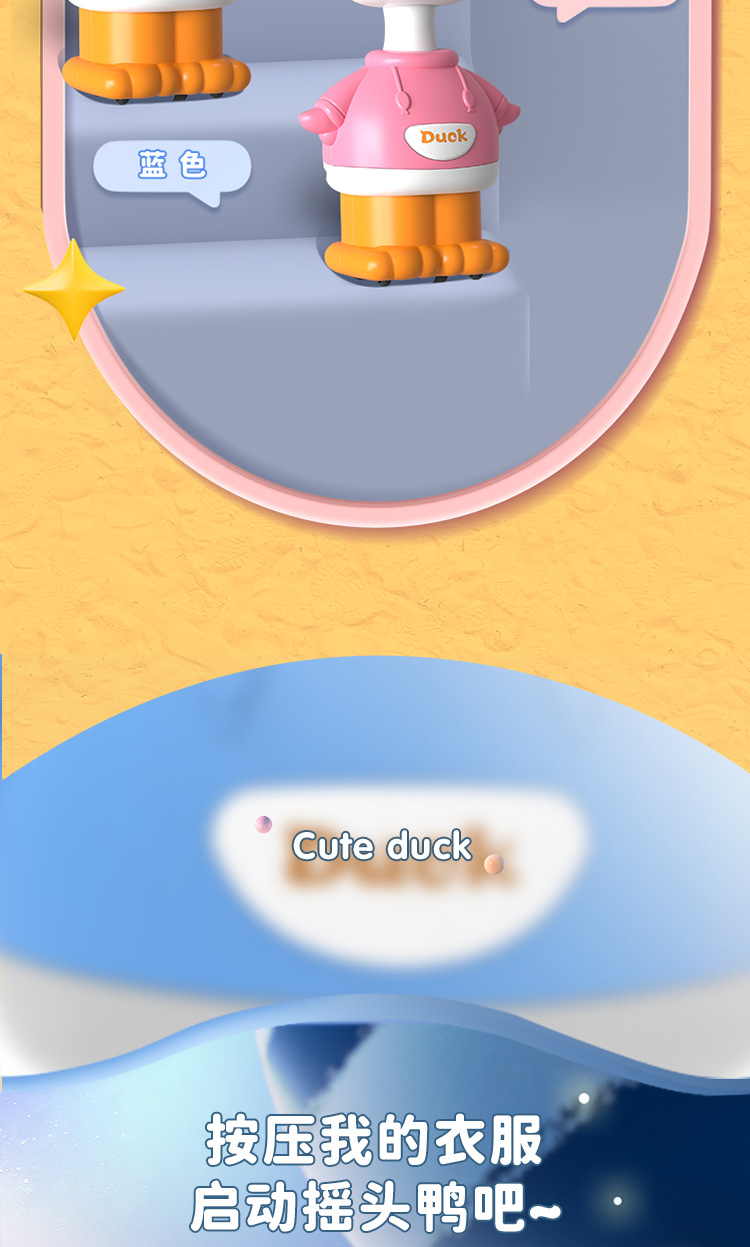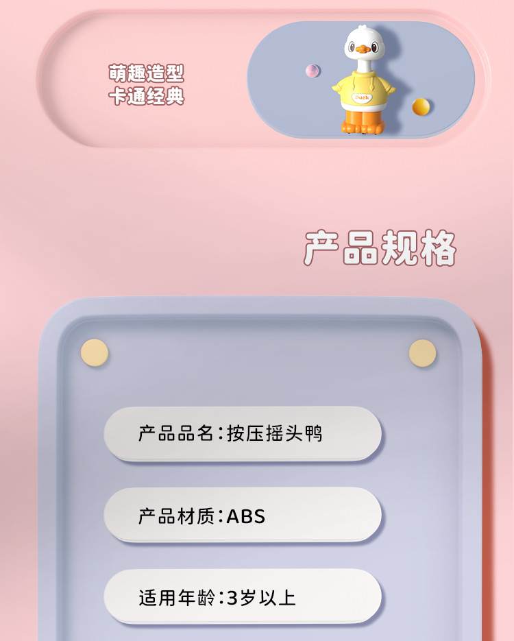 | Especificaciones | Presione el pato que sacude la cabeza - amarillo, Presione el pato que sacude la cabeza - azul, Presione el pato que sacude la cabeza - rosa, Presione el pato que sacude la cabeza - verde, cuatro Patos |