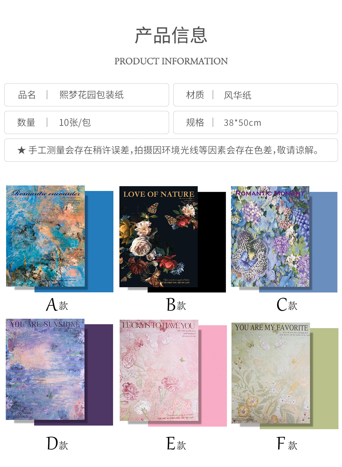 | Especificaciones y modelos | 熙梦花园【A款】38*50cm/10张;包,熙梦花园【B款】38*50cm/10张;包,熙梦花园【C款】38*50cm/10张;包,熙梦花园【D款】38*50cm/10张;包,熙梦花园【E款】38*50cm/10张;包,熙梦花园【F款】38*50cm/10张;包,熙梦花园【G款】38*50cm/10张;包,西西里【A款】38*50cm/10张 风华纸;包,西西里【B款】38*50cm/10张 风华纸;包,西西里【C款】38*50cm/10张 风华纸;包,西西里【D款】38*50cm/10张 风华纸;包,繁花复古【提香红】50*38cm/10张;包,繁花复古【茱萸粉】50*38cm/10张;包,繁花复古【复古咖】50*38cm/10张;包,繁花复古【香芋紫】50*38cm/10张;包,浪漫油画【粉色印象】35*50cm/10张;包,浪漫油画【绿色麦田】35*50cm/10张;包,春日小花DZ蓝色35*50cm 【10张/包】;包,浪漫油画【梦幻遐想】35*50cm/10张;包,浪漫油画【睡莲】35*50cm/10张;包,氛围款【A款】35*50cm/10张;包,氛围款【B款】35*50cm/10张;包,氛围款【D款】35*50cm/10张;包,氛围款【E款】35*50cm/10张;包,氛围款【F款】35*50cm/10张;包,氛围款【G款】35*50cm/10张;包,氛围款【Z款】35*50cm/10张;包,大理石款【璀璨星空紫】38*50cm/10张;包,大理石款【梦幻紫色】38*50cm/10张;包,大理石款【威尼斯棕】38*50cm/10张;包,大理石款【晕染紫色】38*50cm/10张;包,梵境肌理款【A款】35*50cm/10张;包,梵境肌理款【B款】35*50cm/10张;包,梵境肌理款【C款】35*50cm/10张;包,梵境肌理款【D款】35*50cm/10张;包,文艺复兴【B款】35*50cm/10张;包,文艺复兴【C款】35*50cm/10张;包,文艺复兴【D款】35*50cm/10张;包,艺术范【A款】38*49cm/10张;包,艺术范【B款】38*49cm/10张;包,艺术范【C款】38*49cm/10张;包,艺术范【D款】38*49cm/10张;包,西西里【梦幻花园】35*50cm/10张 牛皮纸;包,西西里【浪漫花朵】35*50cm/10张 牛皮纸;包,西西里【朦胧蓝】35*50cm/10张 牛皮纸;包,西西里【紫罗兰】35*50cm/10张 牛皮纸;包 |