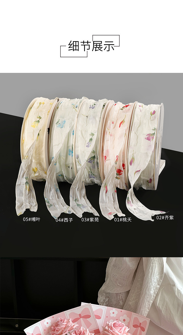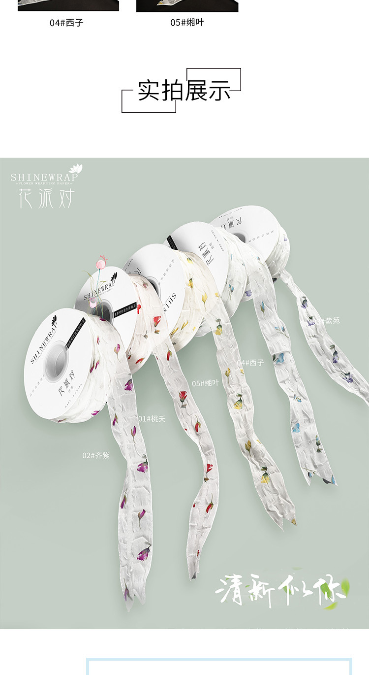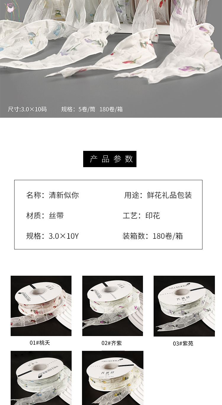| Especificaciones y modelos | 01 ¿ Peach day; 3.0cm * 10 yardas, 02 ¿ Qi zi; 3.0cm * 10 yardas, 03 ¿ ziyuan; 3.0cm * 10 yardas, 04 ¿ xizi; 3.0cm * 10 yardas, 05 hojas; 3.0cm * 10 yardas |