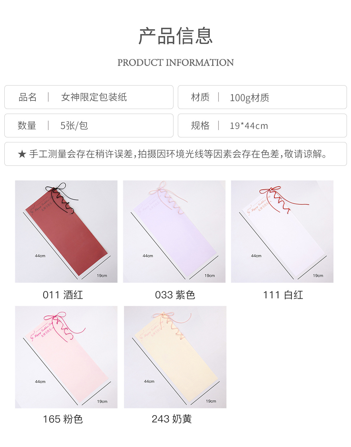 | Especificaciones y modelos | Vino tinto; 19 * 44cm 5 hojas / paquete, rosa; 19 * 44cm 5 hojas / paquete, blanco; 19 * 44cm 5 hojas / paquete, amarillo lecheoso; 19 * 44cm 5 hojas / paquete, púrpura; 19 * 44cm 5 hojas / paquete |