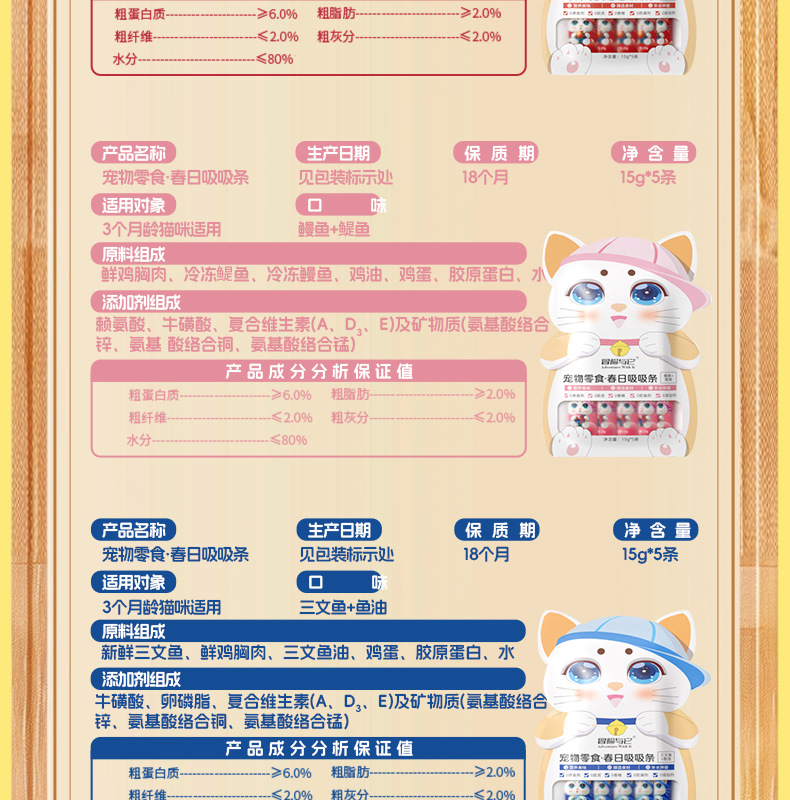 | Sabores | Salmón [aceite de pescado], anguila, bacalao [suplementar lisina], carne de res y pollo [conservación intestinal] |