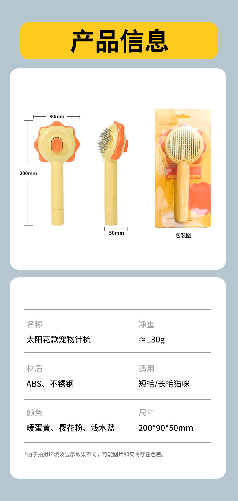 | Especificaciones | Peine del animal doméstico del girasol |