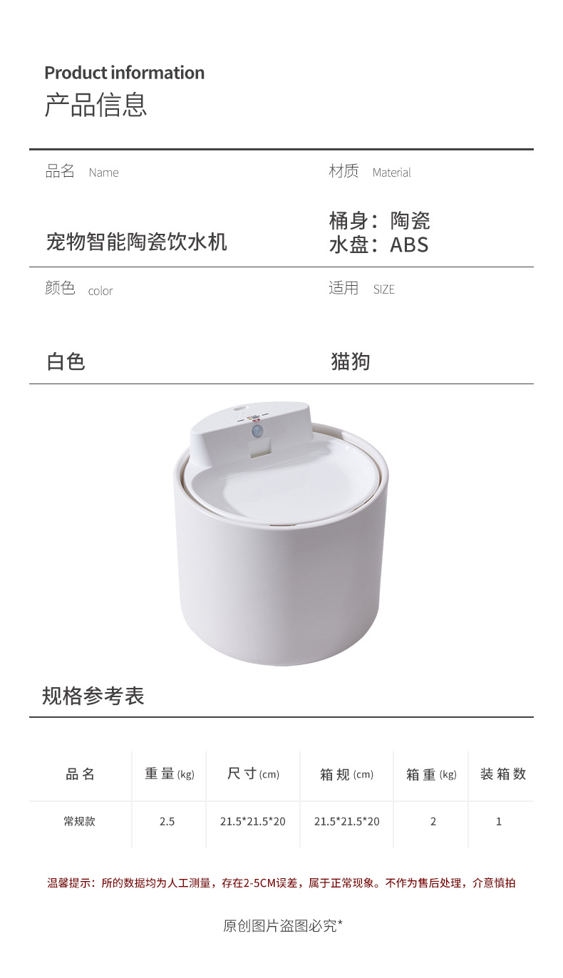 | Especificaciones | Dispensador de agua de cerámica inteligente para mascotas |