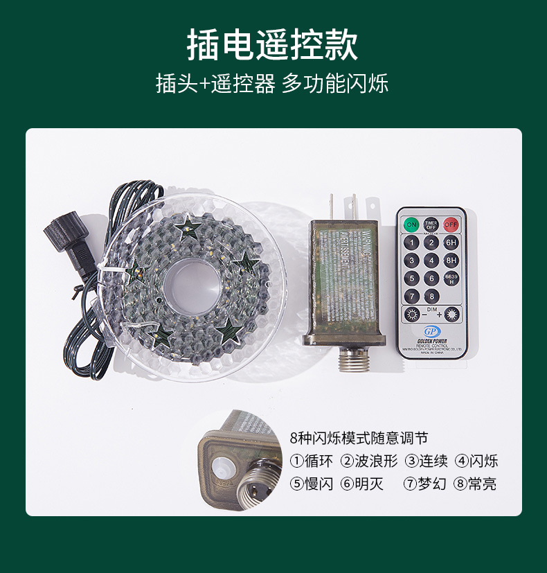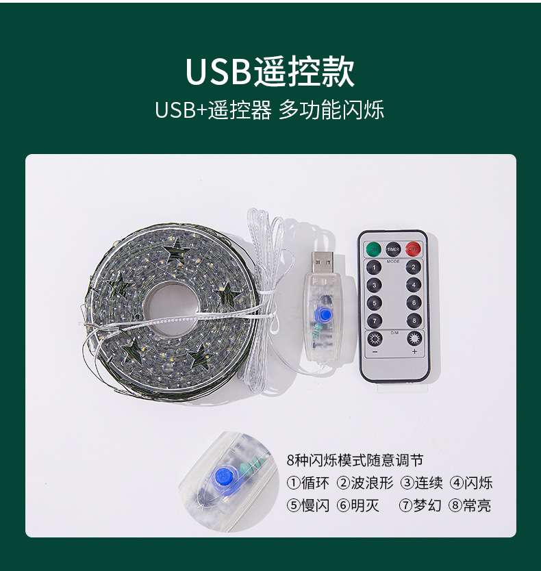 | Potencia | 10m 100 lámparas-USB con control remoto, 20m 200 lámparas-USB con control remoto, 30m 300 lámparas-USB con control remoto, 50m 500 lámparas-USB con control remoto, 100m 1000 lámparas-USB con control remoto, 30m 300 lámparas-LV plug-in con control remoto, 50m 500 lámparas-LV plug-in con control remoto, 100m 1000 lámparas-LV plug-in con control remoto |