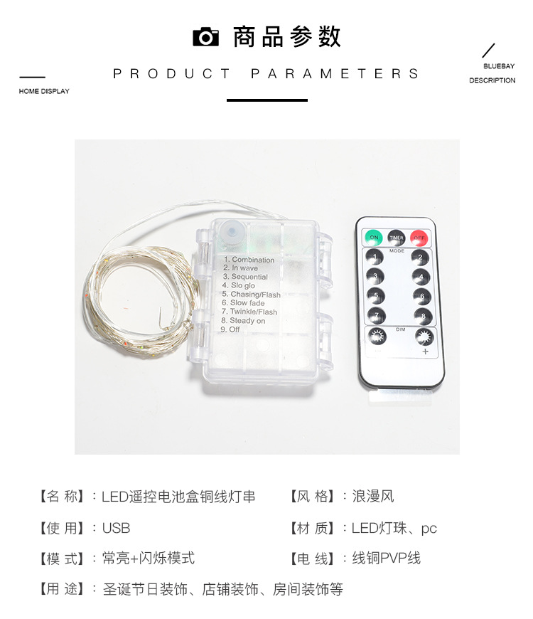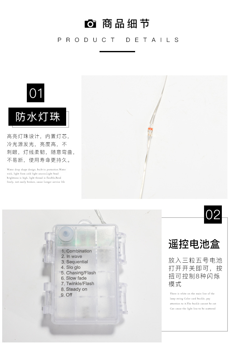 | Potencia | 2 metros 20 lámparas tres cajas de baterías impermeables funcionales + control remoto, 3 metros 30 lámparas tres cajas de baterías impermeables funcionales + control remoto, 4 metros 40 lámparas tres cajas de baterías impermeables funcionales + control remoto, 5 metros 50 lámparas tres cajas de baterías impermeables funcionales + control remoto, 10 metros 100 lámparas tres cajas de baterías impermeables funcionales + Control remoto, 20 metros 200 lámparas tres cajas de baterías impermeables funcionales + control remoto, 30 metros 300 lámparas tres cajas de baterías impermeables funcionales + control remoto |