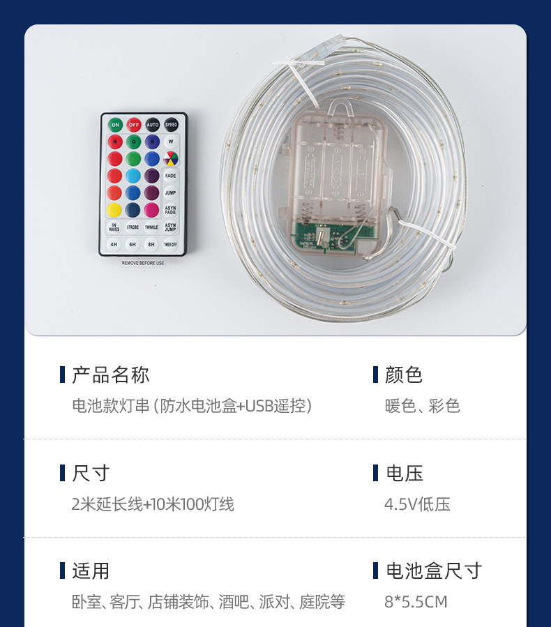 | Especificaciones | Control remoto de la Caja de baterías de 12 metros 100 luces - control remoto de la Caja de baterías de 12 metros 100 luces, control remoto de la Caja de baterías de 17 metros 150 luces, control remoto de la Caja de baterías de 14 metros 120 luces, control remoto de la Caja de baterías de 14 metros 120 luces, control remoto de La Caja de baterías de 10 metros 80 luces, control remoto de la Caja de baterías de 16 metros 140 luces usb, control remoto de la Caja de baterías de 7 metros 50 luces - |