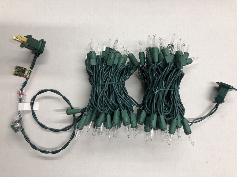 灯串上的100个灯泡在24.75尺长(7.5米)的绿色电线上以3英寸的间距相互隔开
