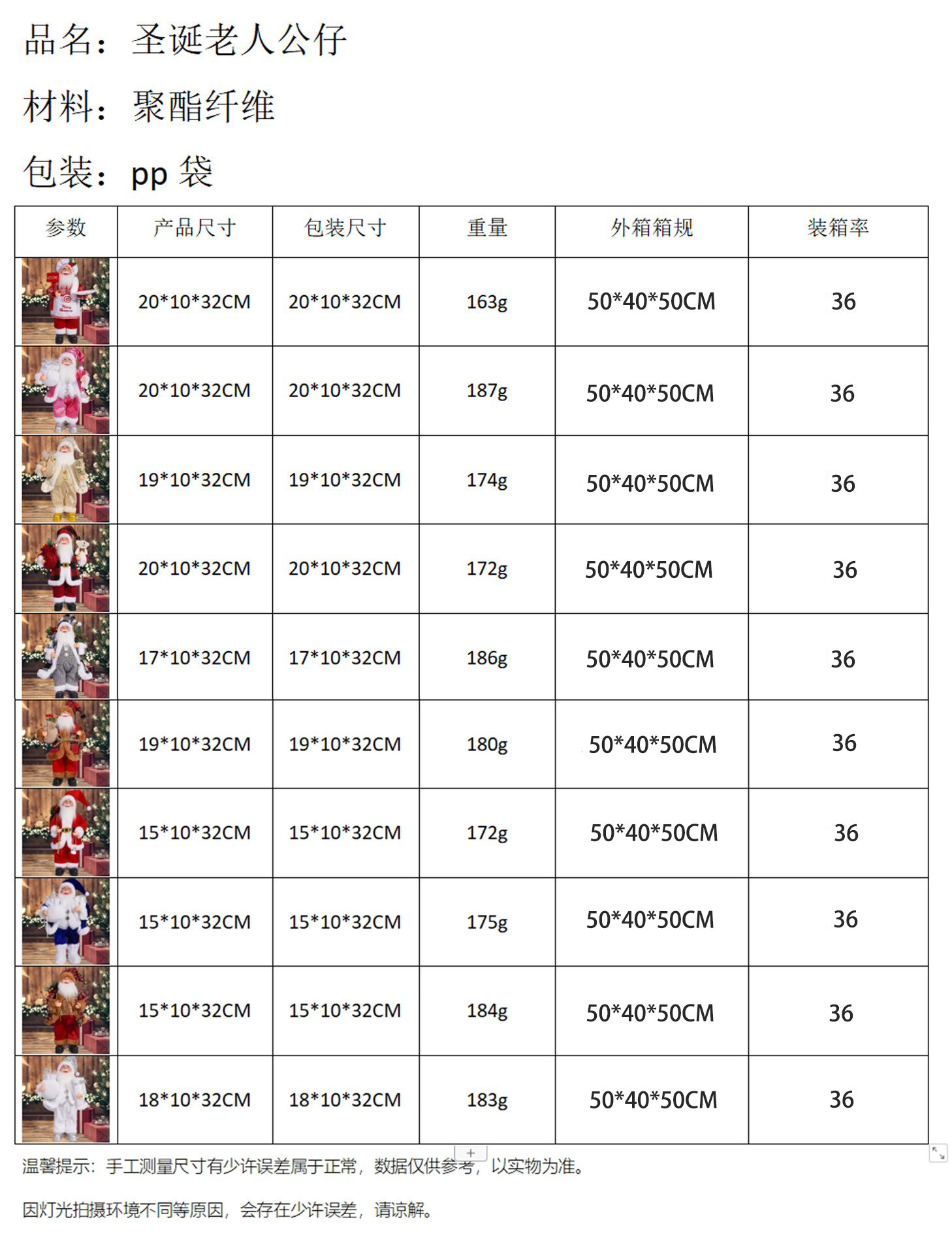 | Colores | Chef Santa Claus,Santa Claus rosa,Papá Dorado,Negro rojo celosía santa claus,Papá Noel a cuadros en blanco y negro,Sosteniendo las ramas de Santa Claus,Rojo Papá Noel,Azul Papá Noel,Papá Noel de oro rojo,Blanco Papá Noel,Papá Noel de punto rojo |