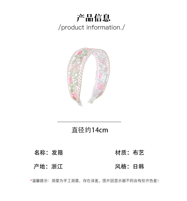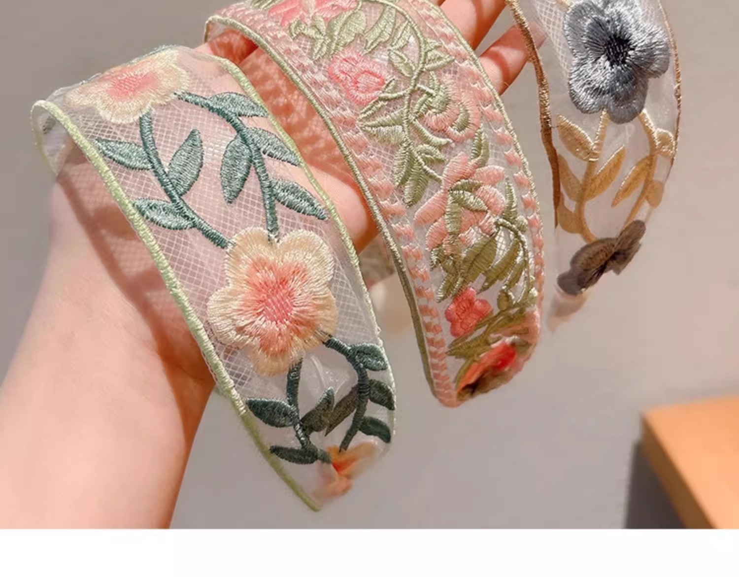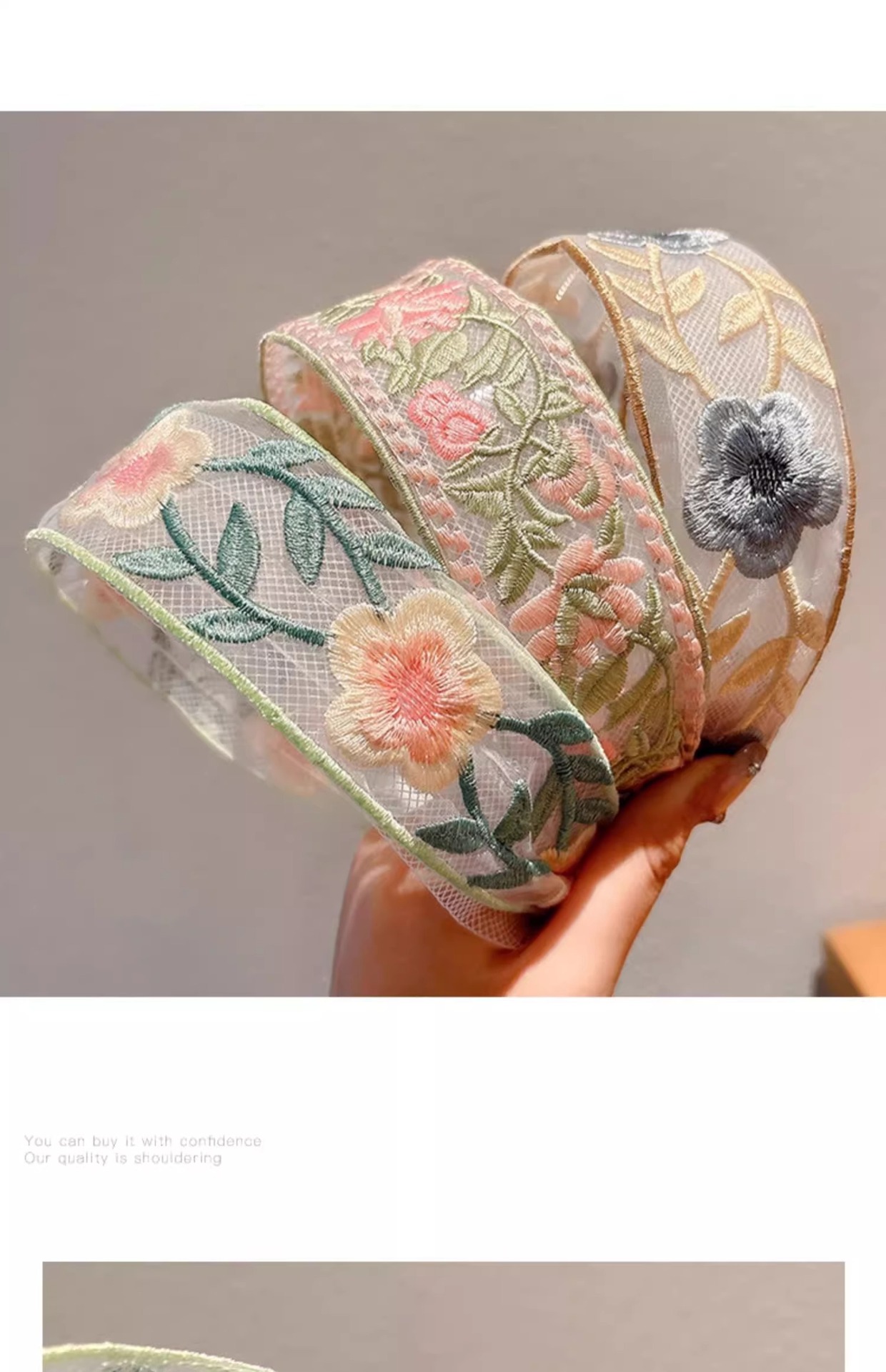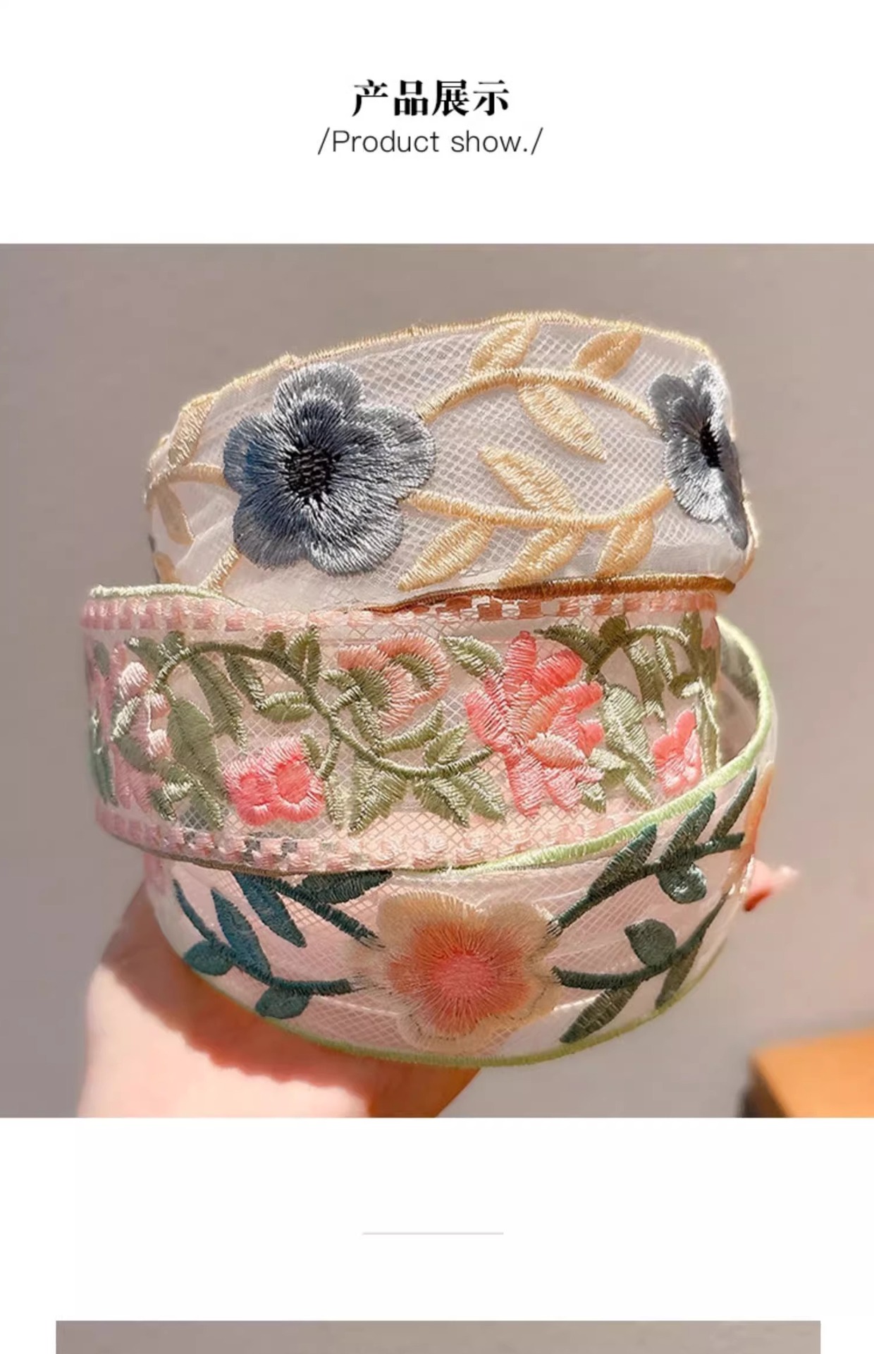 | Color | Bandas de cabello bordadas amarillas en polvo, bandas de cabello bordadas rosadas, bandas de cabello bordadas azules, bandas de cabello bordadas de flores |